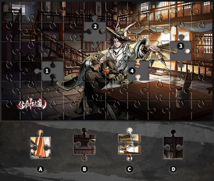 小昭近期获得十二阁尊主之一-午马的人物画卷!奈何藏于地下时间过久,部分画卷腐烂脱离。劳请涤罪师大人完成拼接!小昭准备一些您急缺资源赠予,事成之后画卷也理当与您分享!各位涤罪师可以仔细观察上面的拼图,按照图中1234的顺序,在本贴下方回复对应的字母(如:CBAD)即可赢取资源奖励哦~【活动时间】即日起-4月22日12:00【活动奖励】60元宝、999结续丹更多资讯请关注官方社区平台~#游戏福利