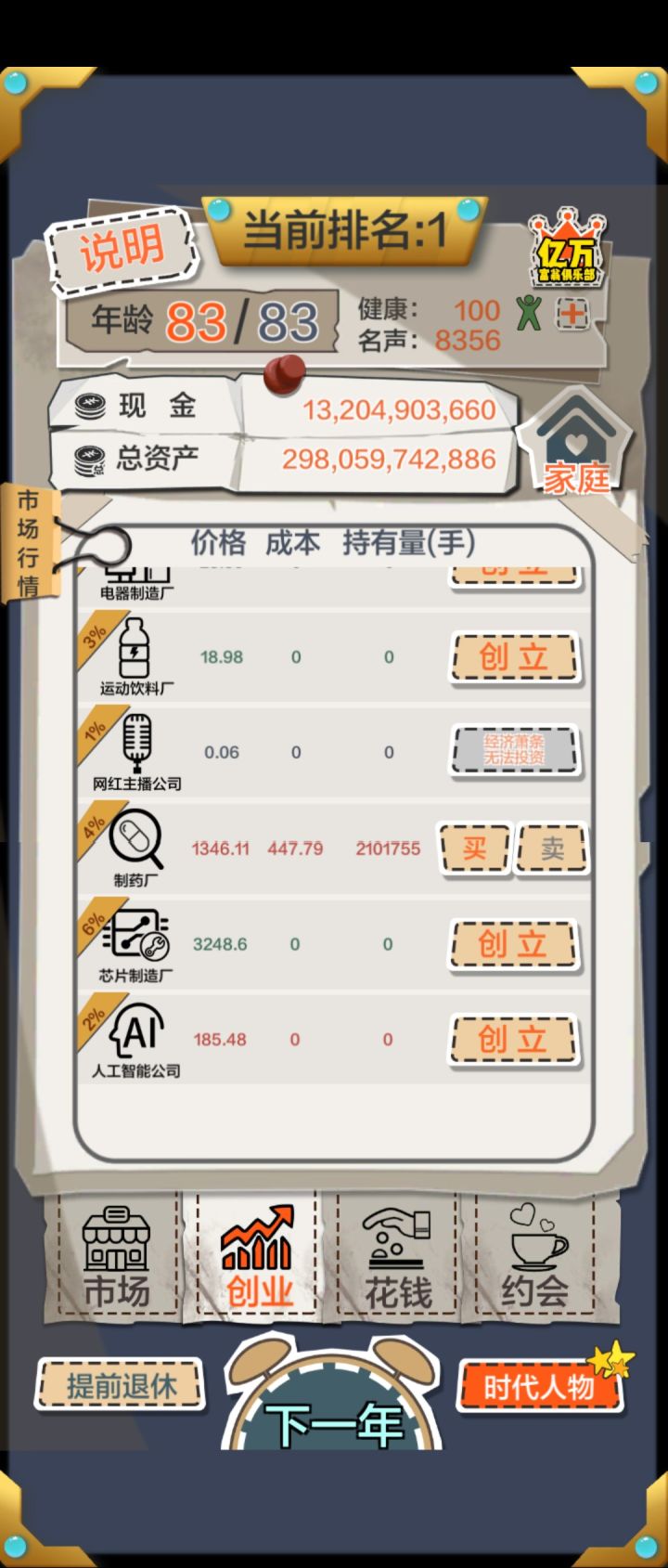 前期发育极其有效 (没解锁包包还有药厂的速度点天赋解锁了啊) 视频中有误操作所以删了一部分 思路: 开局买容易心情激动的物品(通常是包包最容易,低买平卖都会增幅过大) 然后约会圣地(基本一到两次就出文艺了) 约他超便宜的 现金不过万(买了物品没有钱就行) 然后等暴富(低价包到手一到两年必暴富) 当然在怎么富有也就差不多10w这时候有文艺的话,他会写作,然后你可以直接拿200w 这时候开仓库(继续屯包,如果买的低价的包又会暴富,要是买的高价那就亏,不过文艺青年不管你暴富还是穷都会写书,懂?) 然后就能一波拿下药厂,运气好房地产或者芯片厂也能一起拿下 然后你只需要不断的投资药厂 同时低买高卖就行了 速刷一局500+天赋点