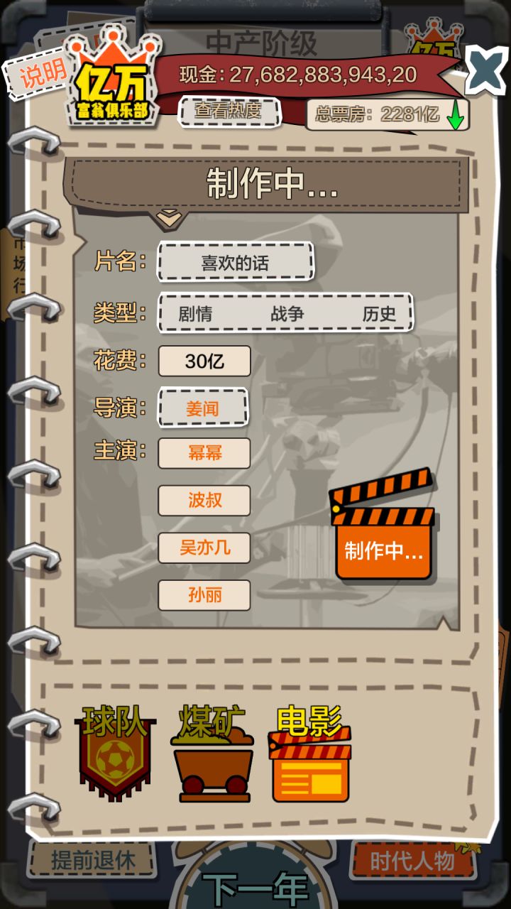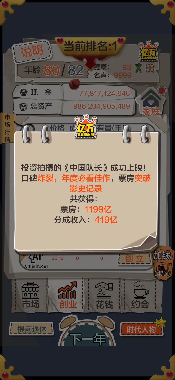 ↑1900万亿的时候我已经数不过来了,就进时代人物看了下↑这个界面已经显示不全了,看不出多少亿↑最终2299万亿结束主要就是25岁爆了个名牌包,过千万了,然后买了制药厂就起飞了,57岁左右倒卖球队过百亿,第二次起飞。因为想要电影成就,每两年就拍一次电影,但是总票房总是500-800亿左右,什么成就也完不成,十分蛋疼,只好当拍着玩了,这个版本想做电影成就太难了因为拍电影,60多岁以后就把冷