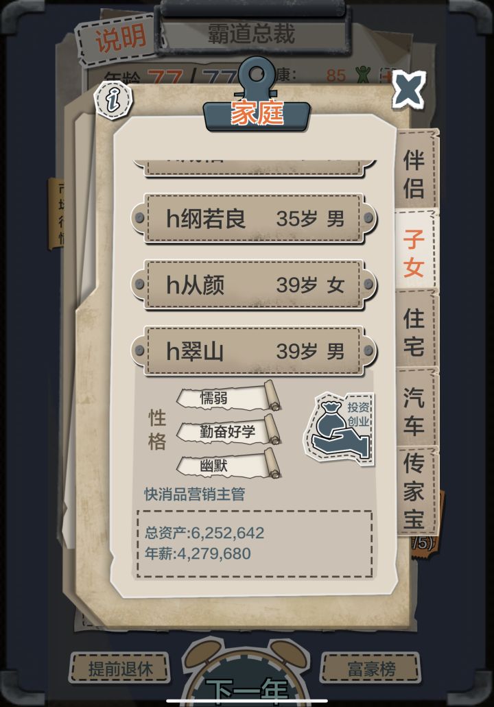 一、萌新快速上手攻略如果你还没有达到十亿、百亿的级别的话,可以看一下以下的攻略,高玩跳过。后面附速刷天赋点的方法,家族产业缺人的话,也可以去看一下。其实,很多萌新攻略百度都能找的到,已经很详细了,可以去看下。我只说一下我自己对游戏的理解以及版本更新变动注意的地方,还有某些点在他人攻略上说的更加详细。首先,开局伴侣选择初中师妹或者大哥,别听别人说刷不到大哥就退休重开,师妹足够你过渡前期了,我前