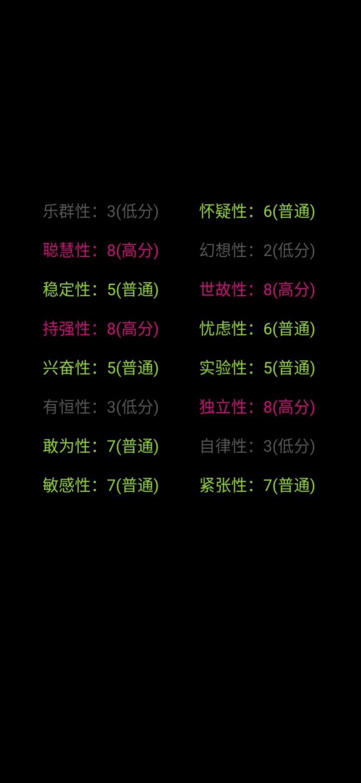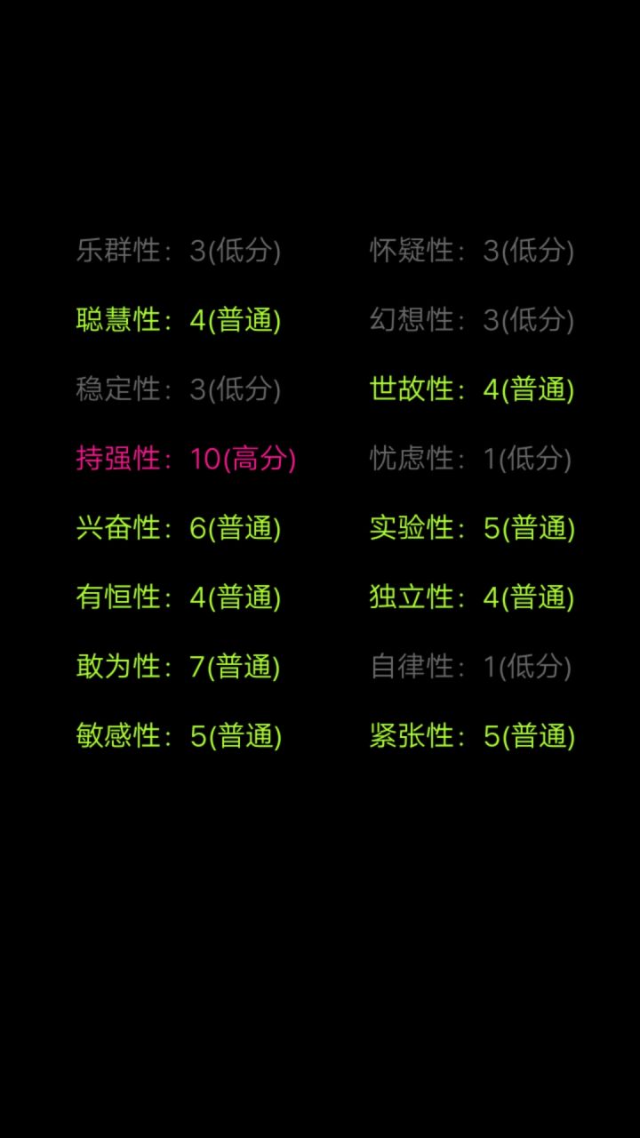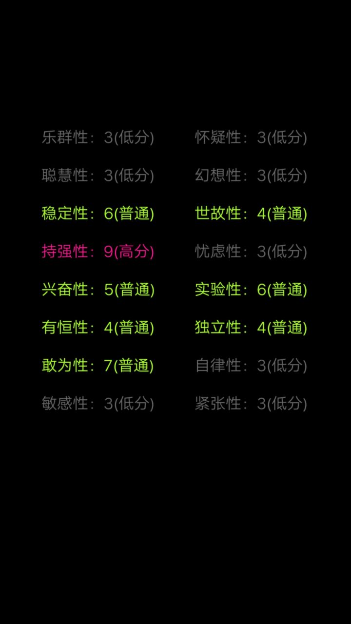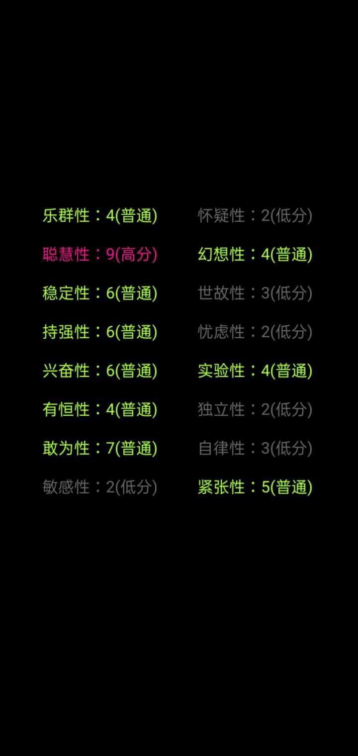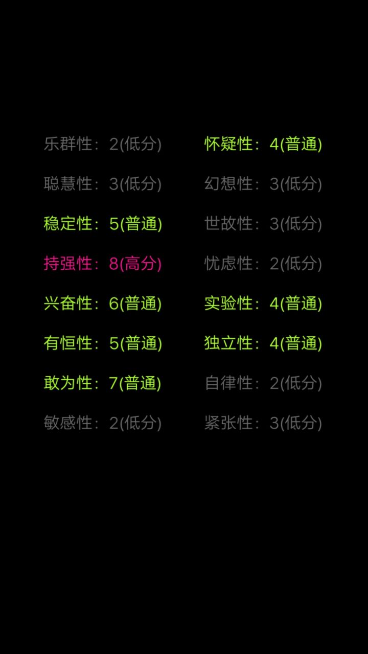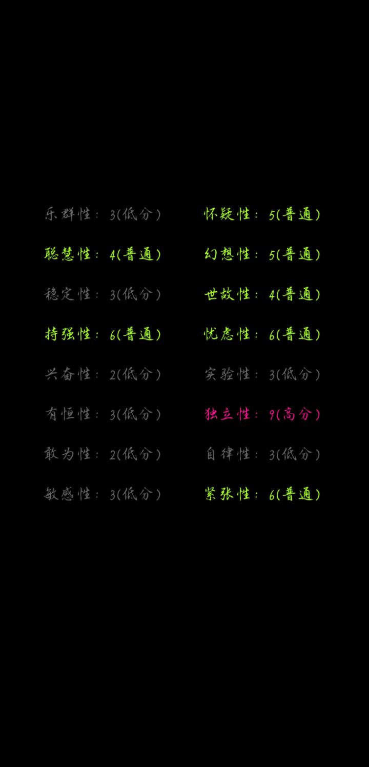 我一眼望过去,好像就我是一片绿色。为什么自律是低分呢?实际上我也不确定我是一位网文写手,能自律到每天按时写下几千字,也是一位学生,一到假期笔都懒得动。但我觉得这份测试很有趣,也挺准的