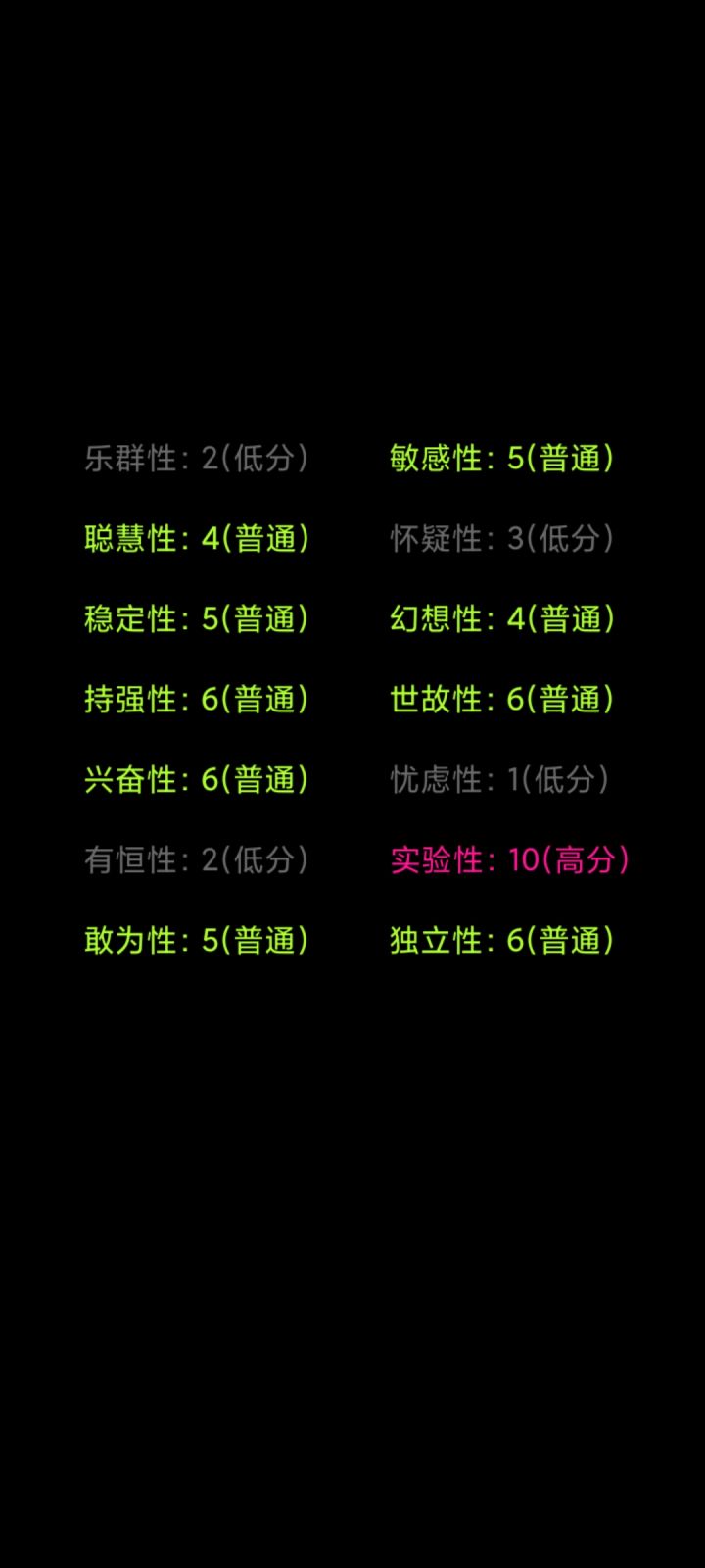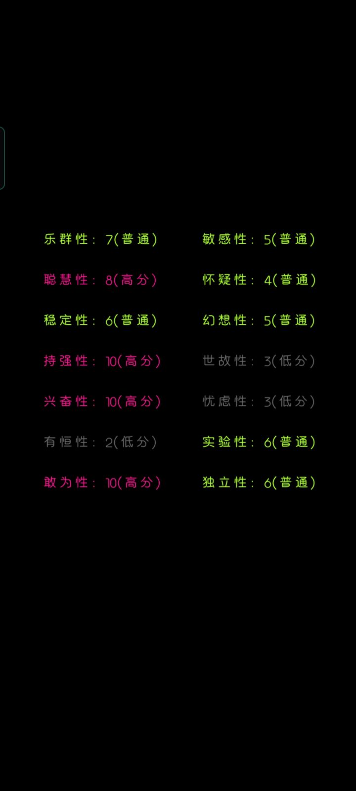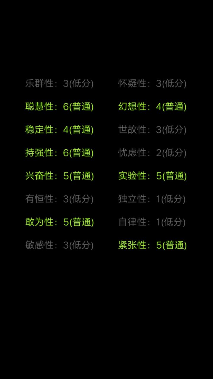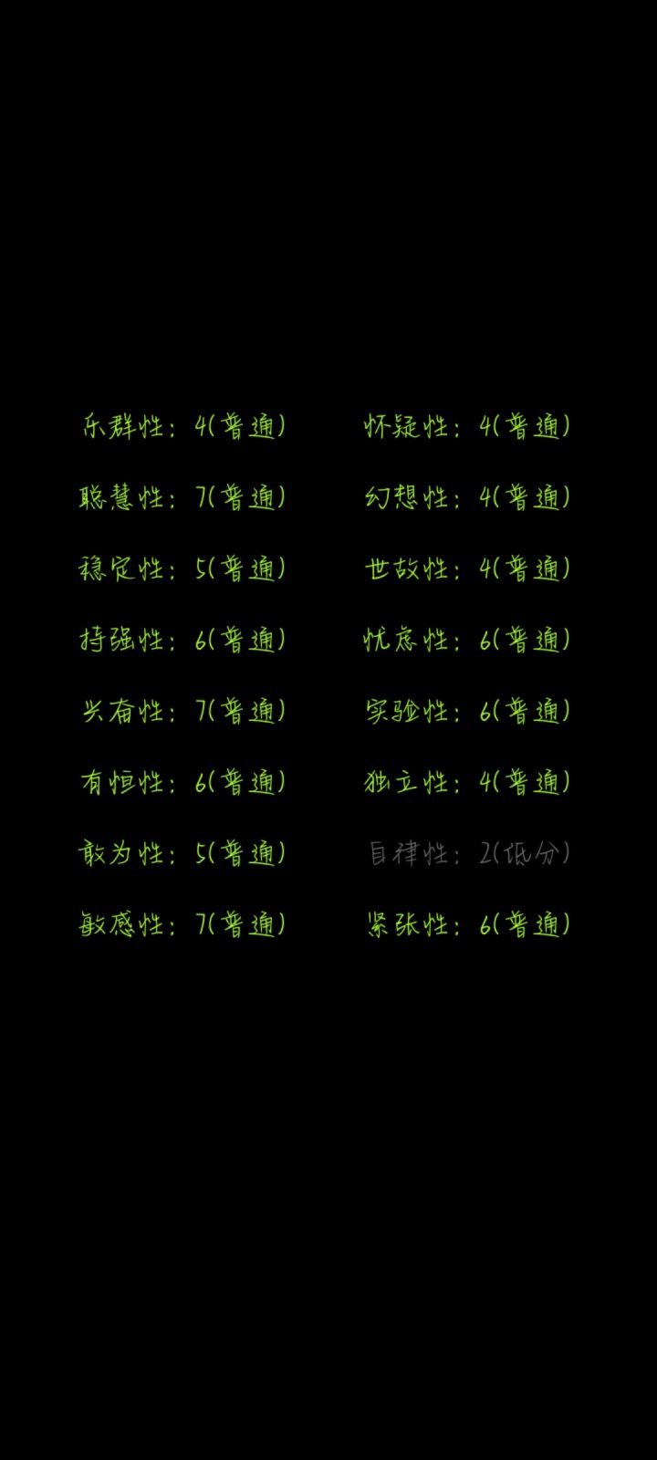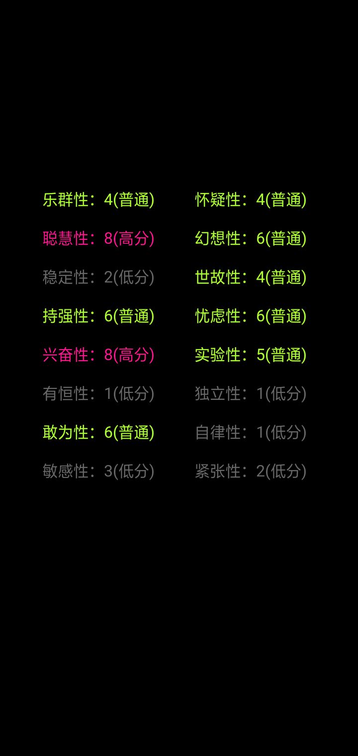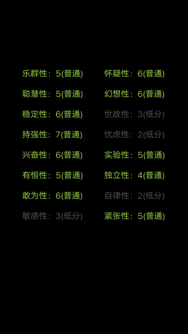 我一眼望过去,好像就我是一片绿色。为什么自律是低分呢?实际上我也不确定我是一位网文写手,能自律到每天按时写下几千字,也是一位学生,一到假期笔都懒得动。但我觉得这份测试很有趣,也挺准的