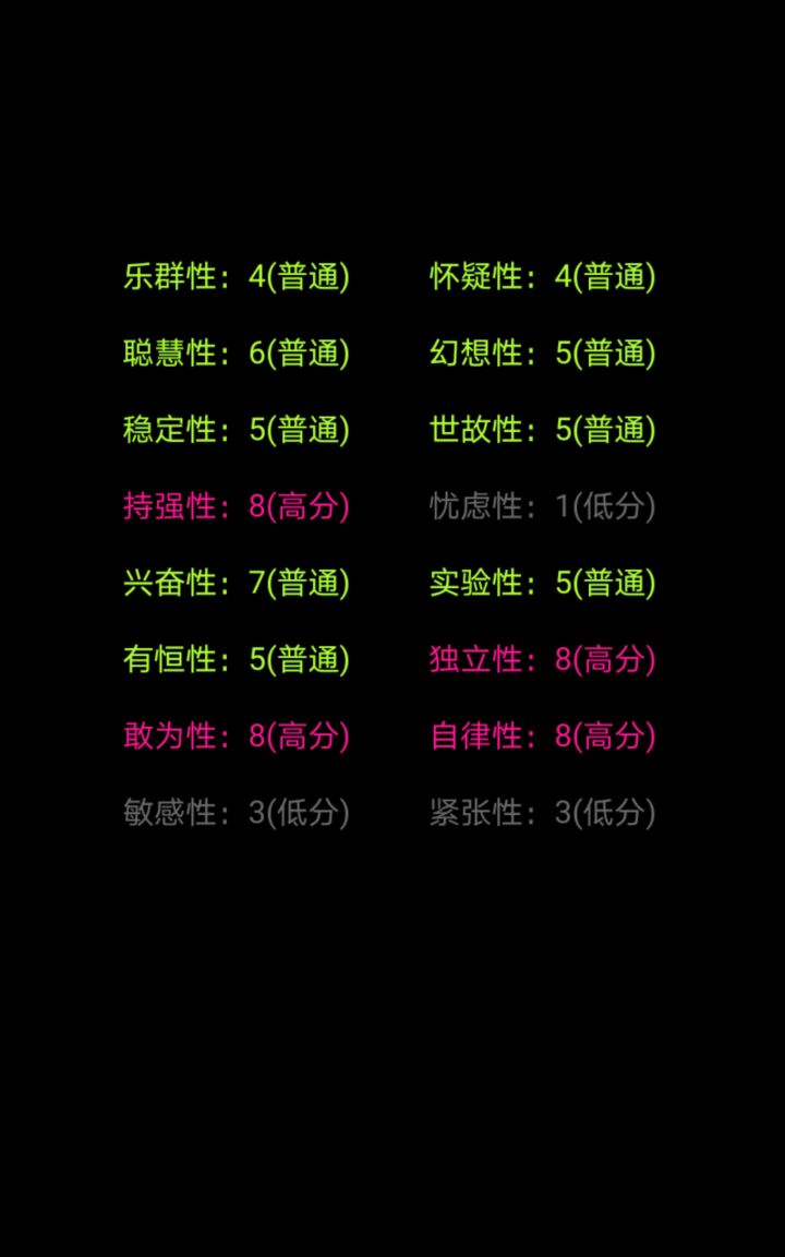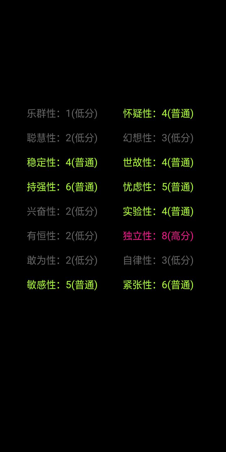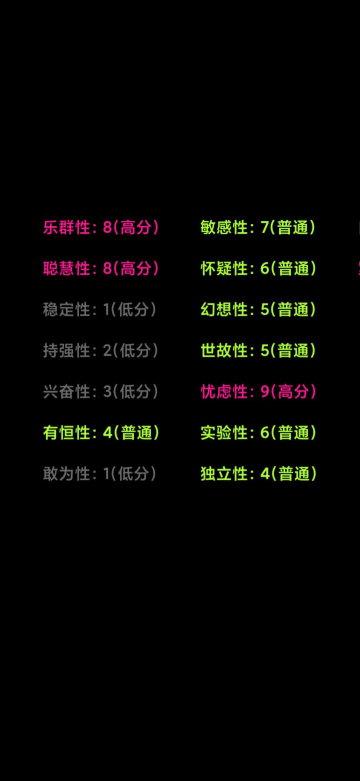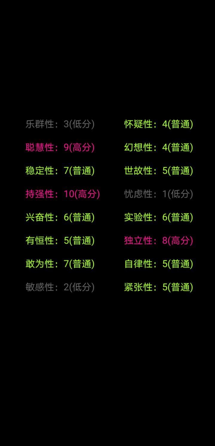 我个人感觉这款游戏的测评并不准确,问题的回答太死板,每个人都是独一无二的,并不是一个小小的且死板的测评就能评价的,不要因为一个小小的评价而低头丧气的哦,祝各位新的每一天,阳光快乐信心满满,都有好心情