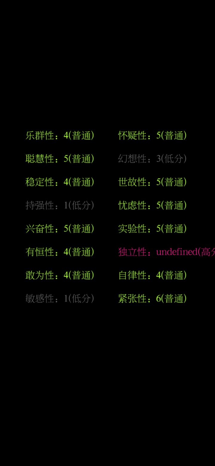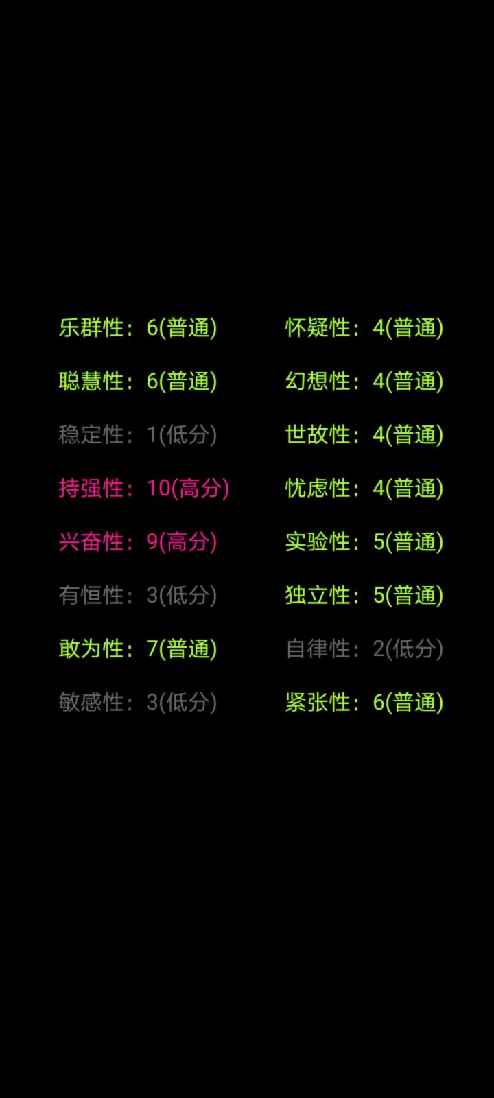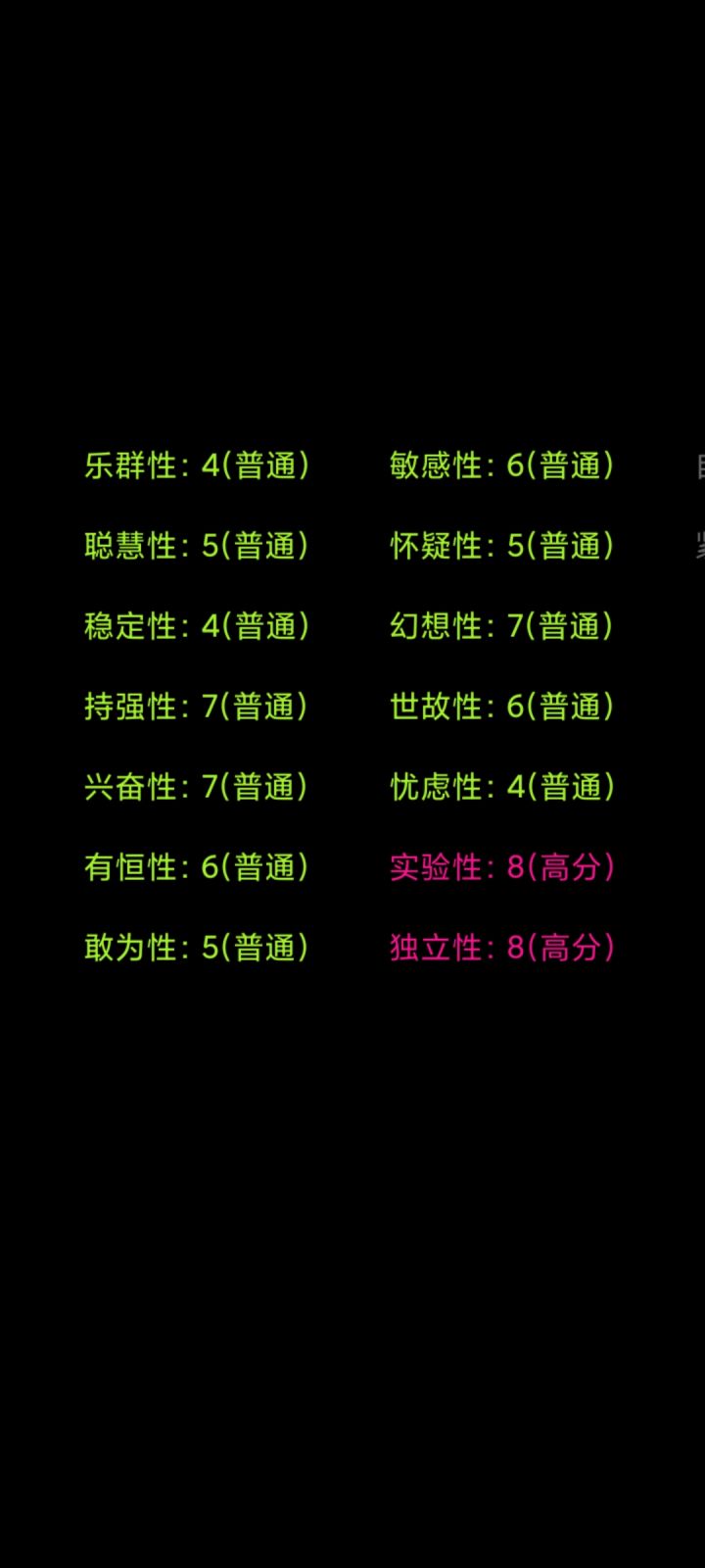 我个人感觉这款游戏的测评并不准确,问题的回答太死板,每个人都是独一无二的,并不是一个小小的且死板的测评就能评价的,不要因为一个小小的评价而低头丧气的哦,祝各位新的每一天,阳光快乐信心满满,都有好心情