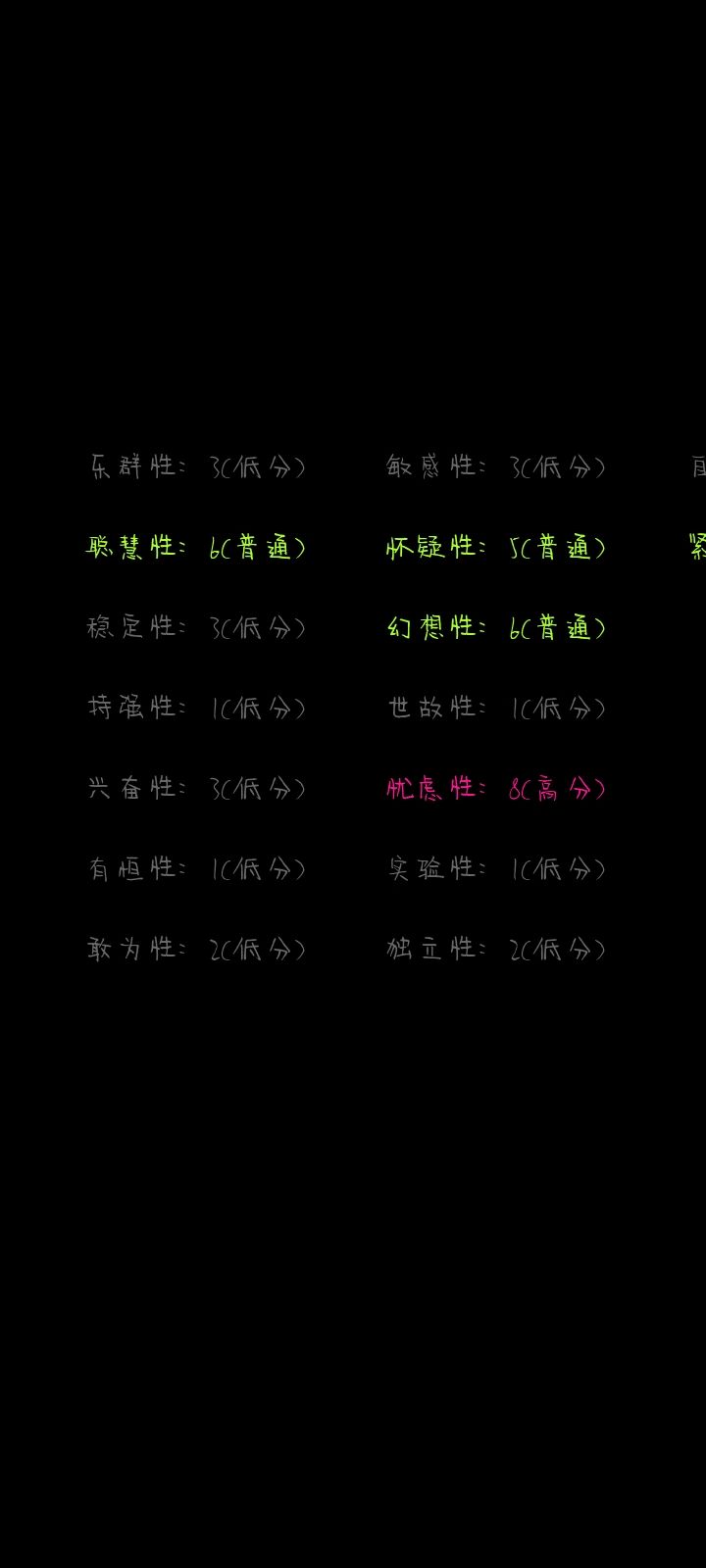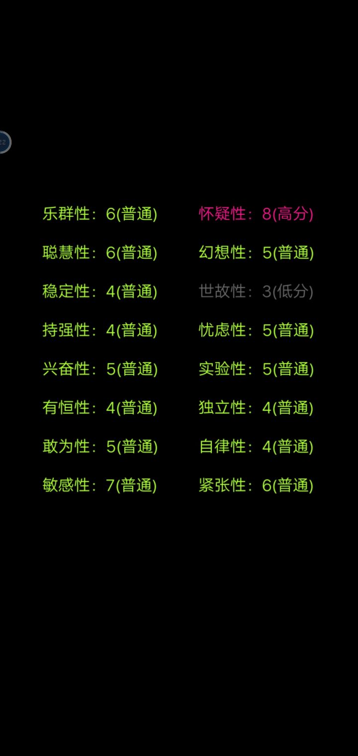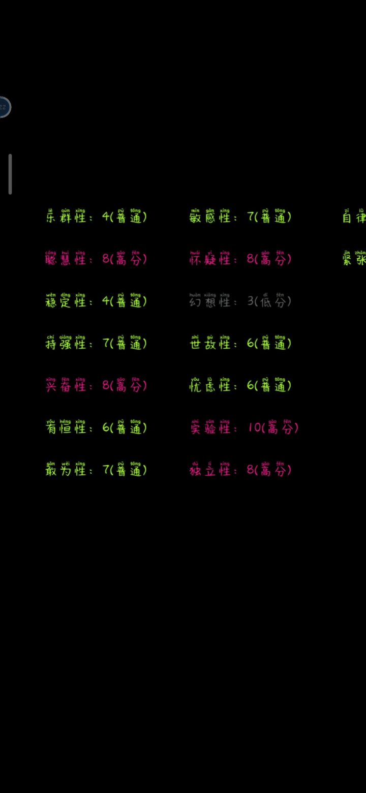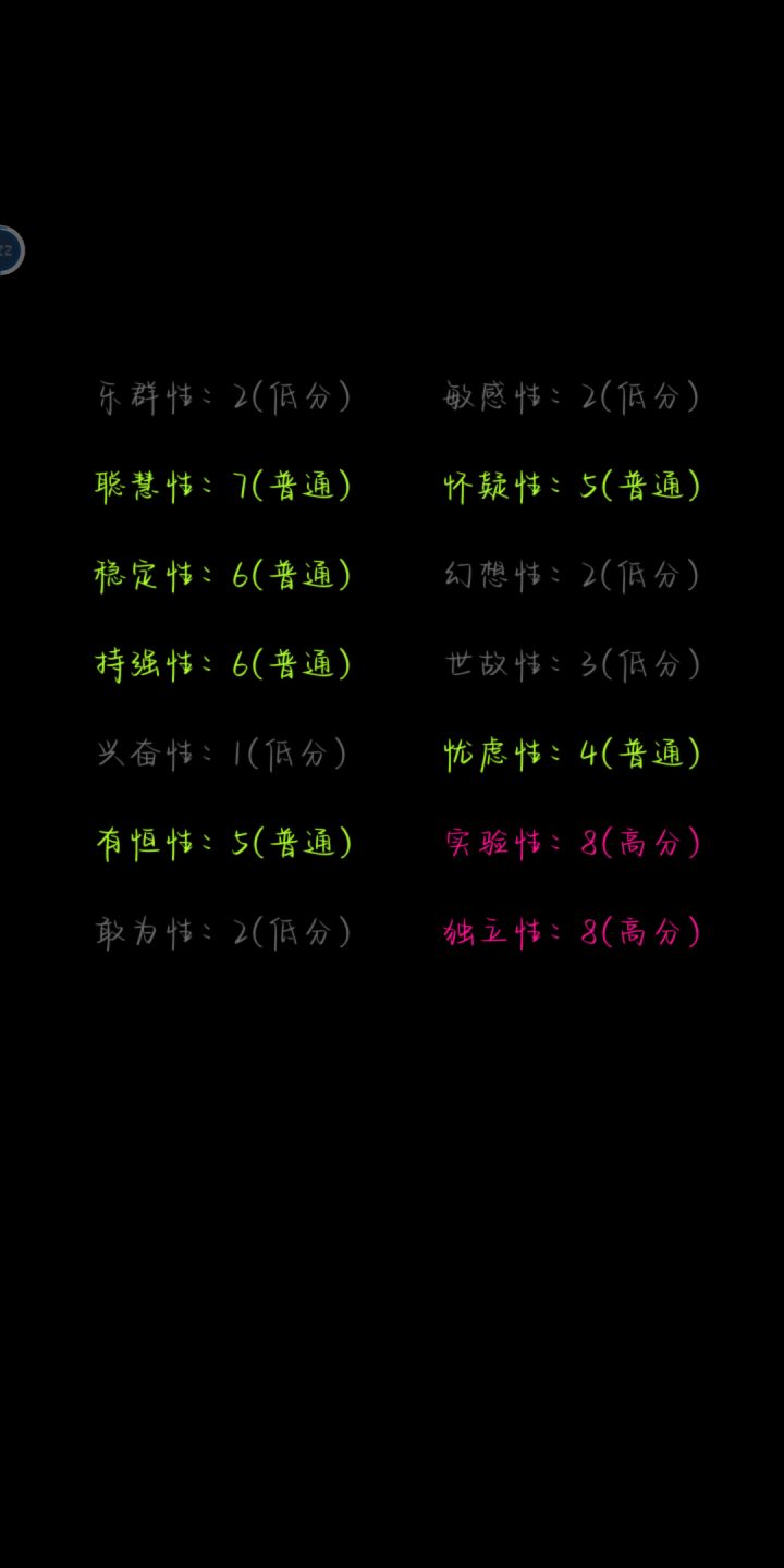 emm只截了后面的解释,就用文字叭怀疑性:9(高分)乐群性:5(普通)聪慧性:8(高分)稳定性:5(普通)持强性:7(普通)兴奋性:6(普通)有恒性:1(低分)敢为性:6(普通)敏感性:7(普通)幻想性:7(普通)世故性:3(低分)忧虑性:5(普通)实验性:3(低分)独立性:5(普通)自律性:4(普通)紧张性:7(普通)