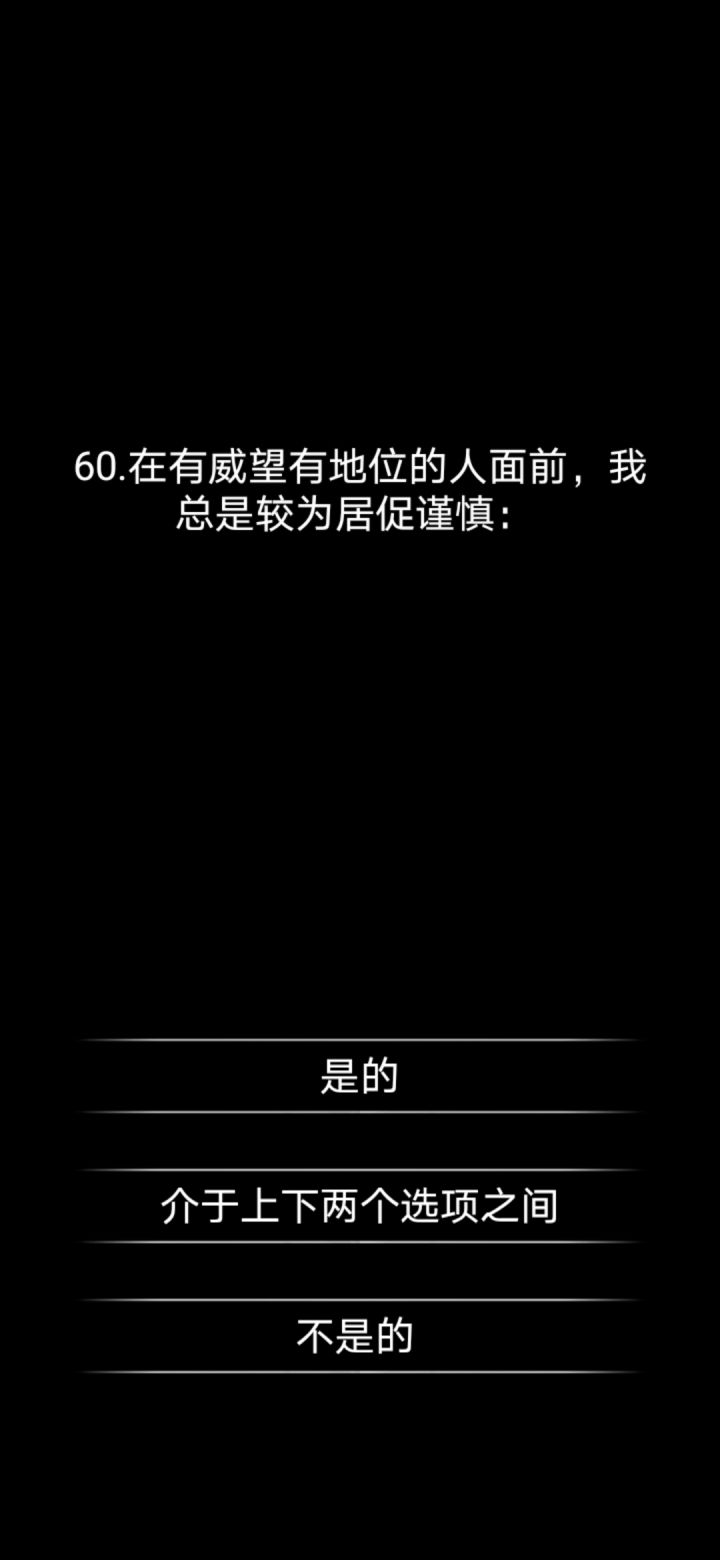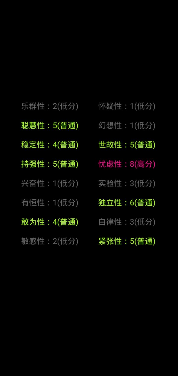 咱就是说吧,做的挺不错的,问题就是有时候觉得某个选项错了不能反悔重做😭😭就有点遗憾,但是也算是仅供参考嘛,里边说的有些地方以我个人是不太认同的(与个人自我认知不同),但是仅供参考嘛,自我与他人眼中的我总是不同的。过一段时间再来试试😁😁