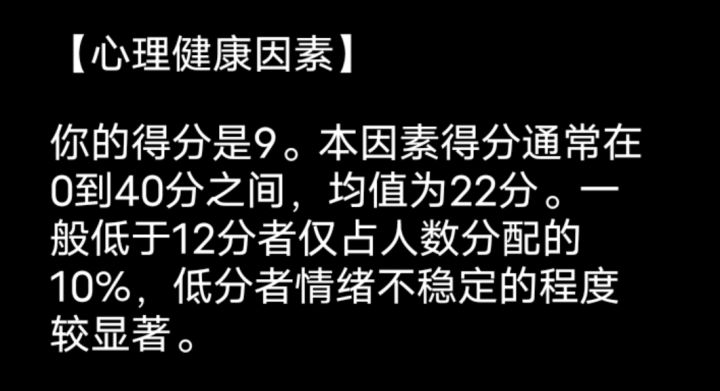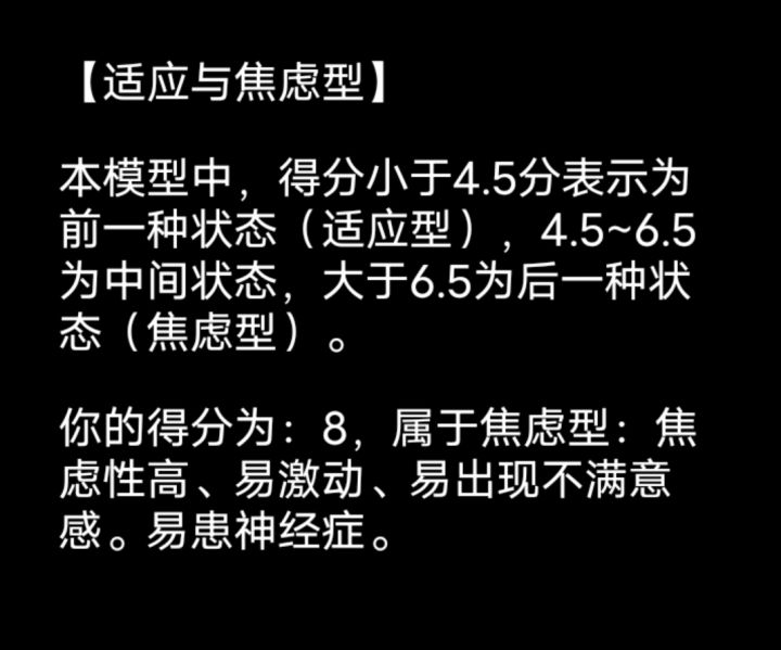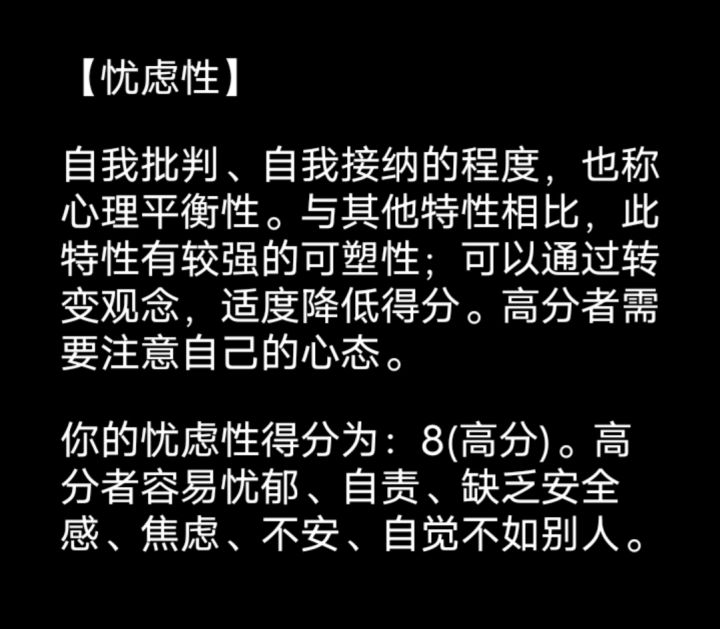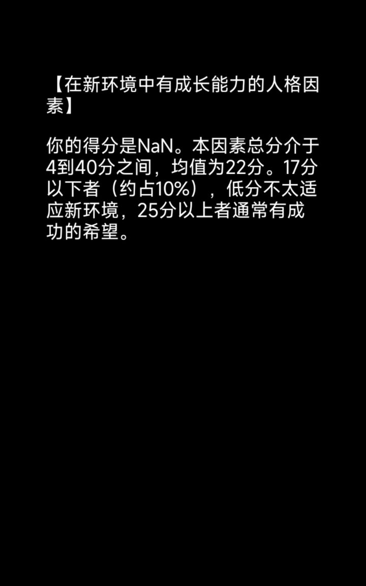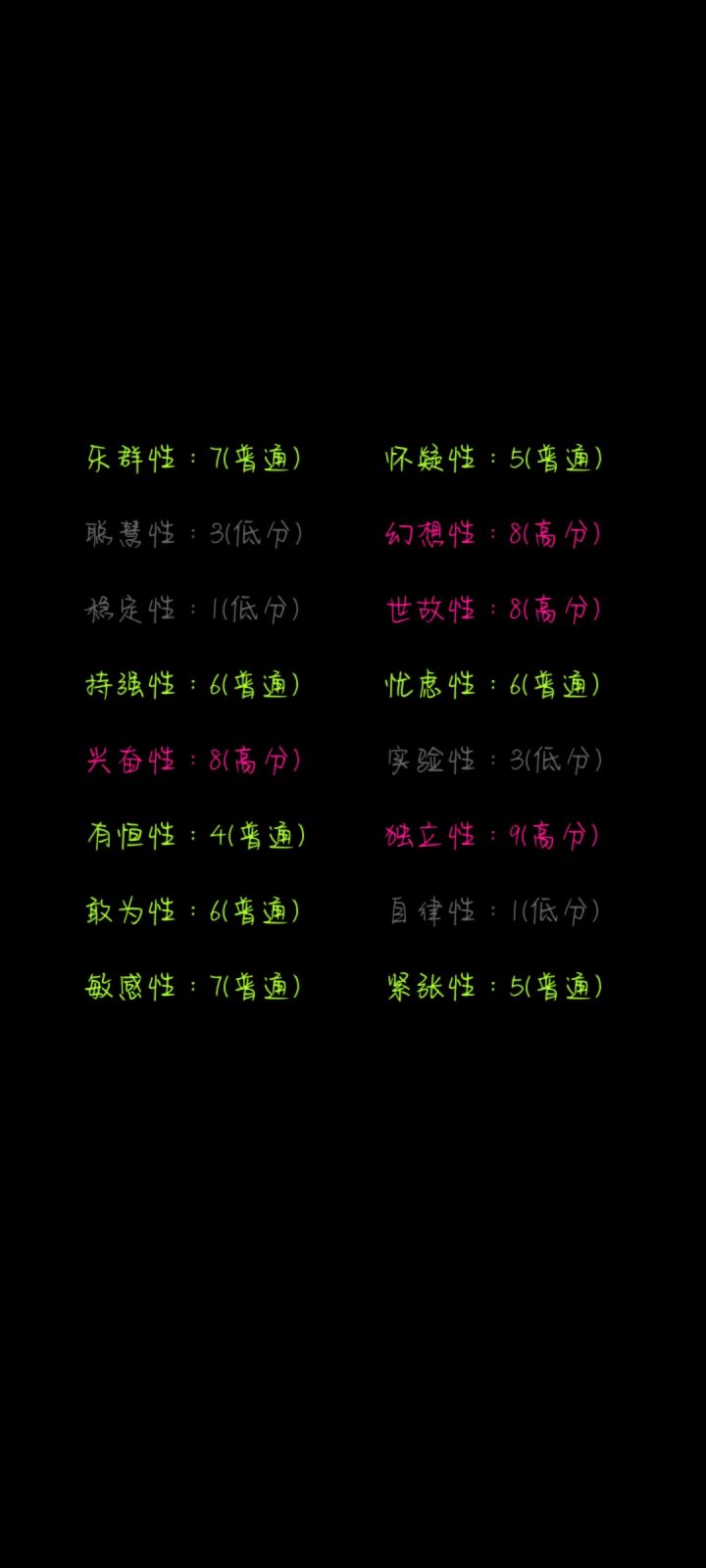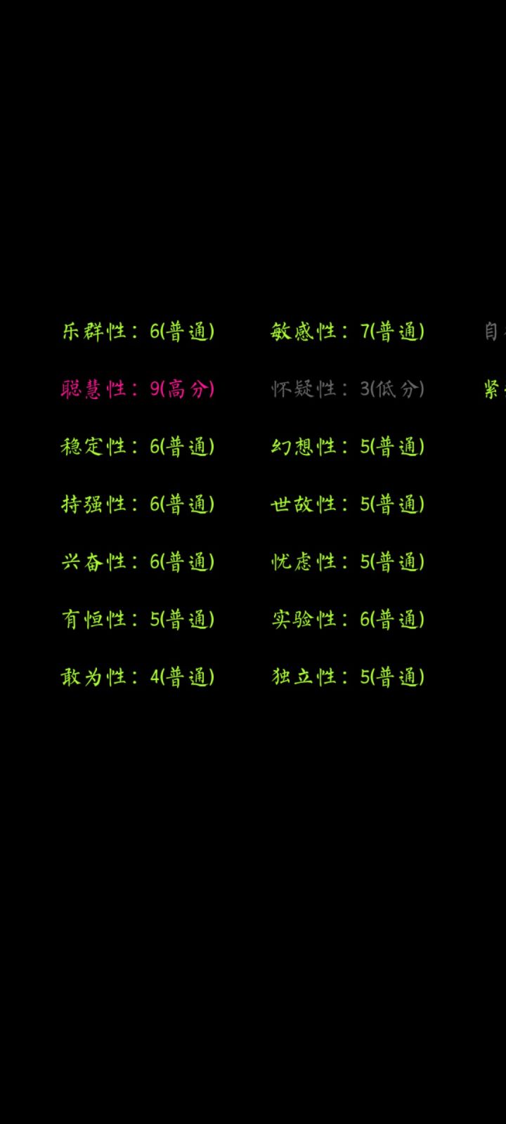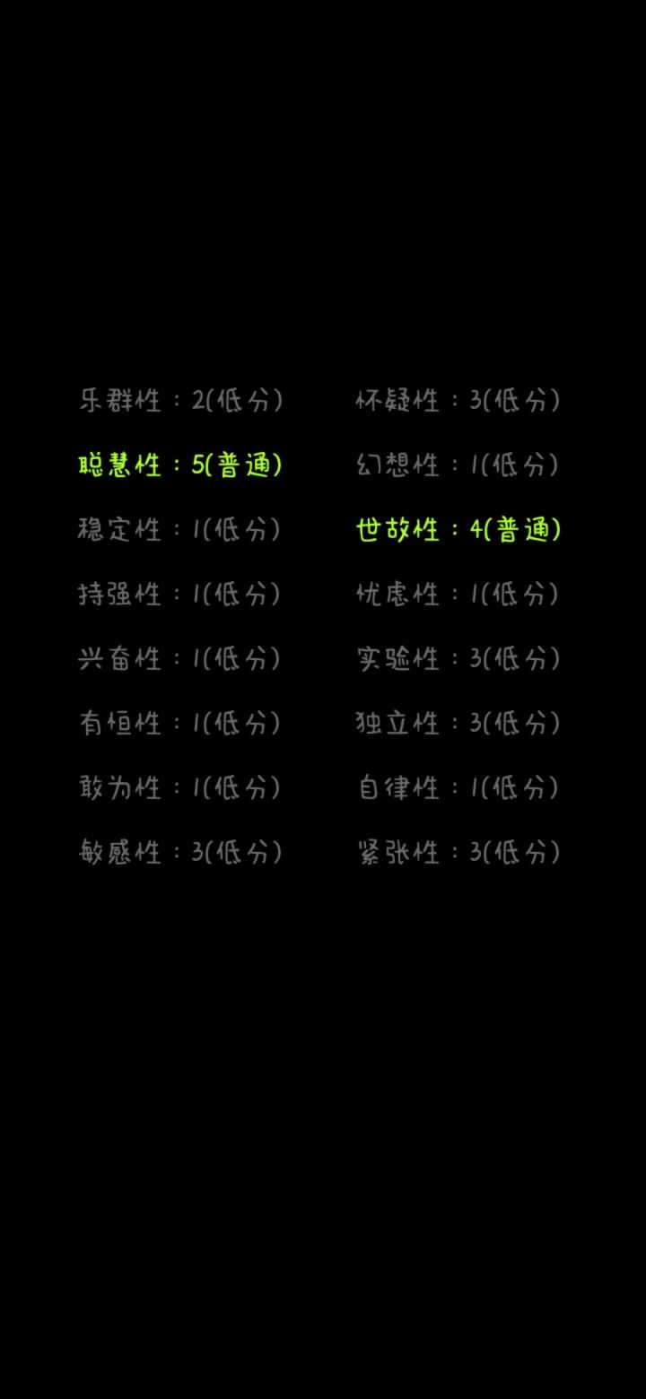 这个游戏里面的测试还挺有意思的,今天终于测完了,感觉结果还是有点区别的。但是那个自律性确实挺正确的。