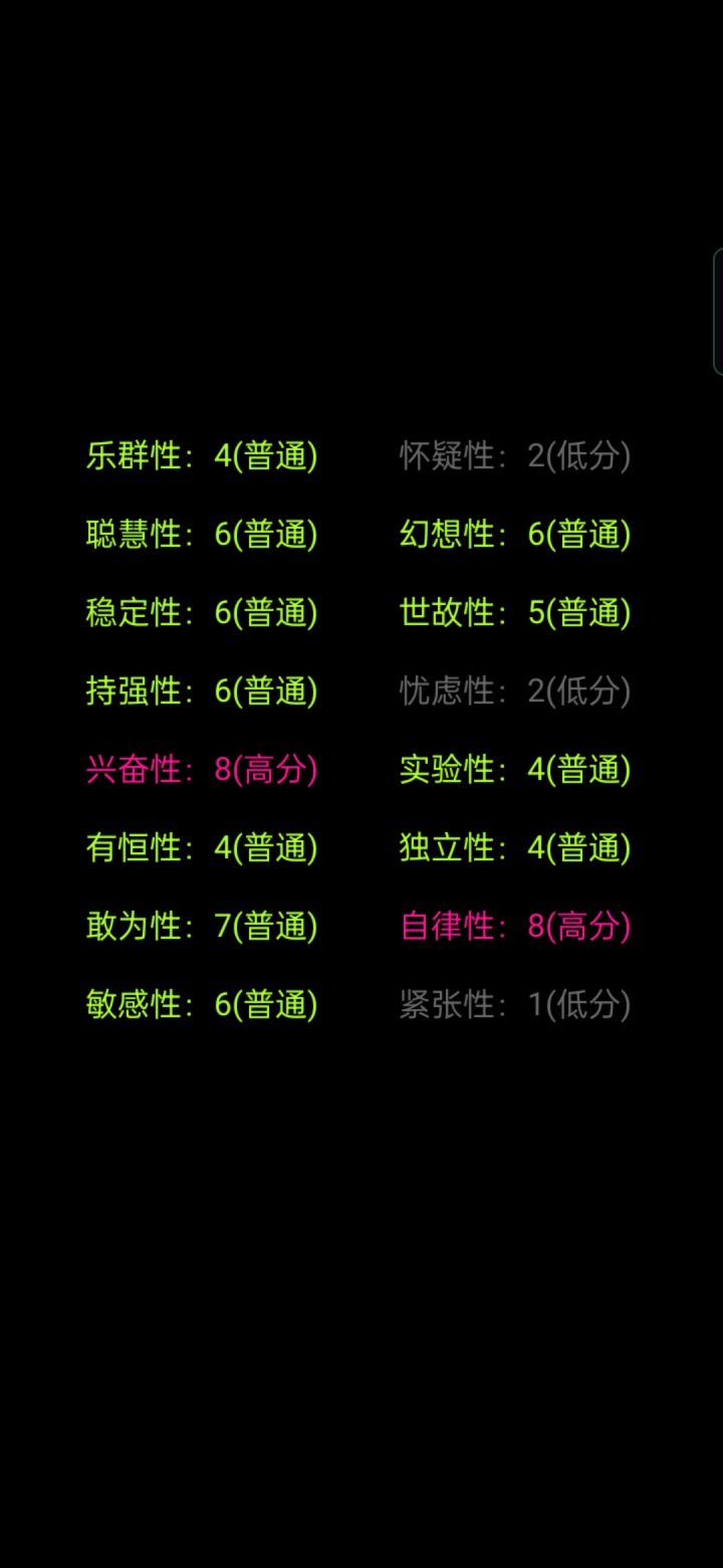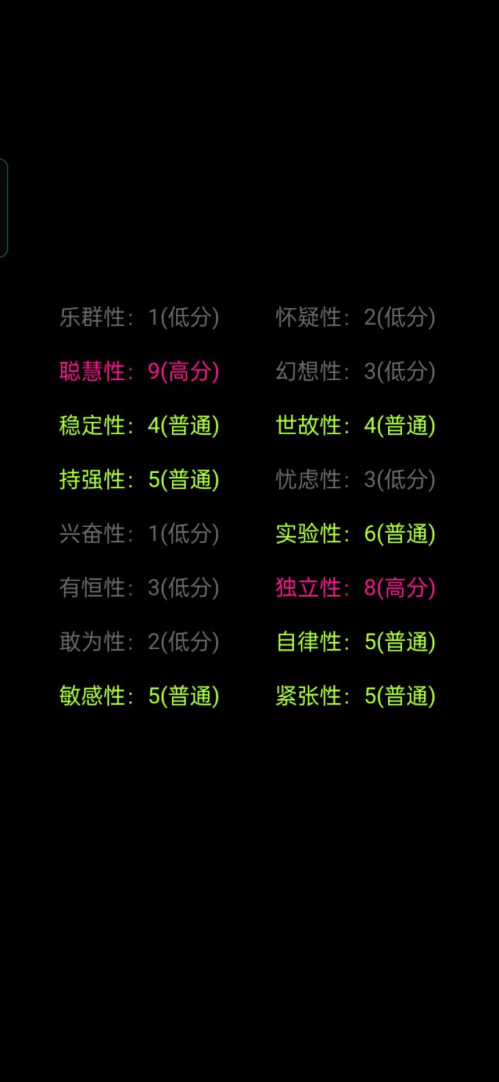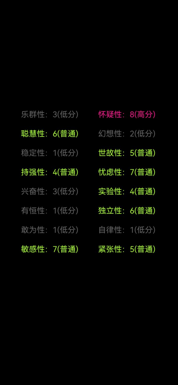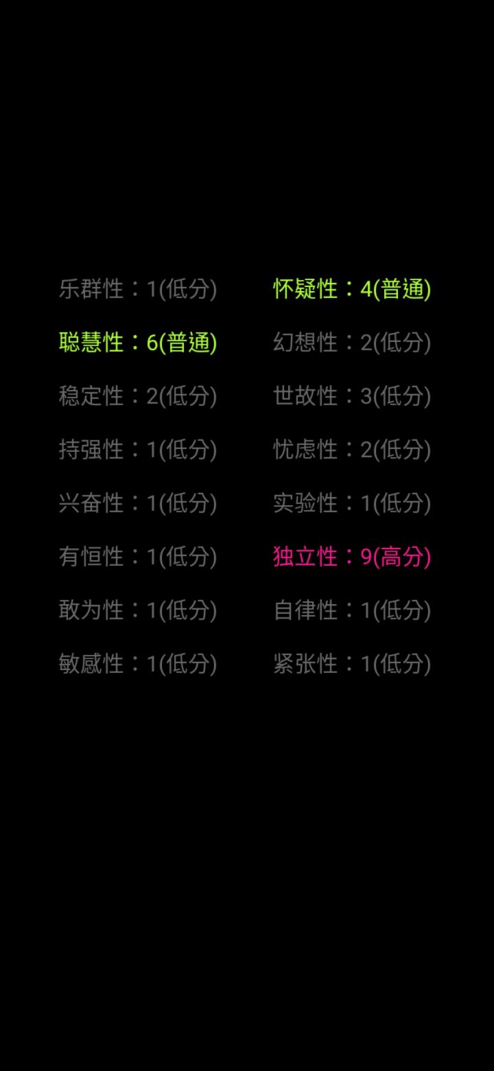 虽然是一款心理问卷为基础的游戏但是多多少少想提一点小建议让它的“游戏性”能再强点1:BGM的问题,只有开头和结尾时会出现BGM(我不知道是不是刻意这样设计)但是就个人感觉来讲如果能在过程中加入BGM会好点。2:可以尝试下加入背景插画之类的东西3:可以尝试下加入点动画效果,我明白单纯的渐入渐出是为了营造一种氛围,但多多少少会有点单调,在结尾统计处可以试试尝试下不同的表现形式和动画效果。暂时只能想到这些第一次写这种东西只是想把自己的感受表达一下如果有不同的意见也欢迎交流。