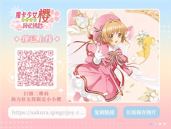 快来和我一起收集全世界的可爱,《魔卡少女樱回忆钥匙》手游正式上线!参与活动还可获得限定五星小小樱https://sakura.qingcijoy.com/pre-registration/index_mobile.html?friend_id=224485
