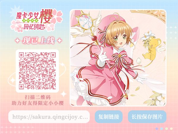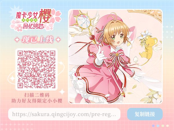 梦境相遇,可爱同行!限定五星小小樱等你来拿~我在《魔卡少女樱回忆钥匙》等你哦https://sakura.qingcijoy.com/pre-registration/index.html?friend_id=203637