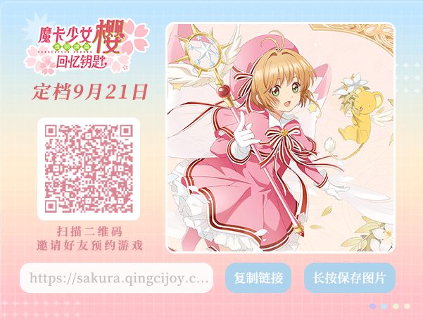 你想拥有限定小小樱盲盒吗?《魔卡少女樱回忆钥匙》9月21日梦境相约,参与预约活动即可获得限定五星盲盒!https://sakura.qingcijoy.com/pre-registration/index_mobile.html?friend_id=76157
