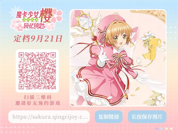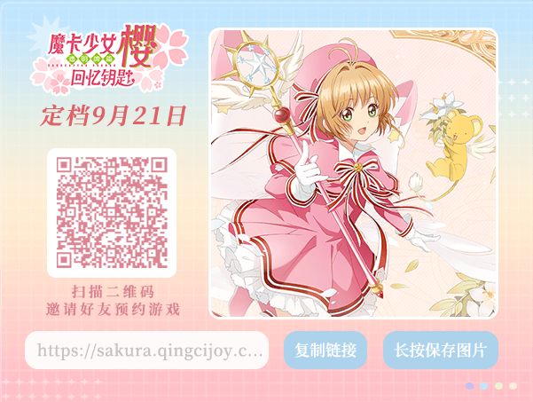 《魔卡少女樱回忆钥匙》手游9月21日正式上线!完成预约活动可得限定小小樱盲盒,一起来收集全世界的可爱吧!https://sakura.qingcijoy.com/pre-registration/index_mobile.html?friend_id=26512