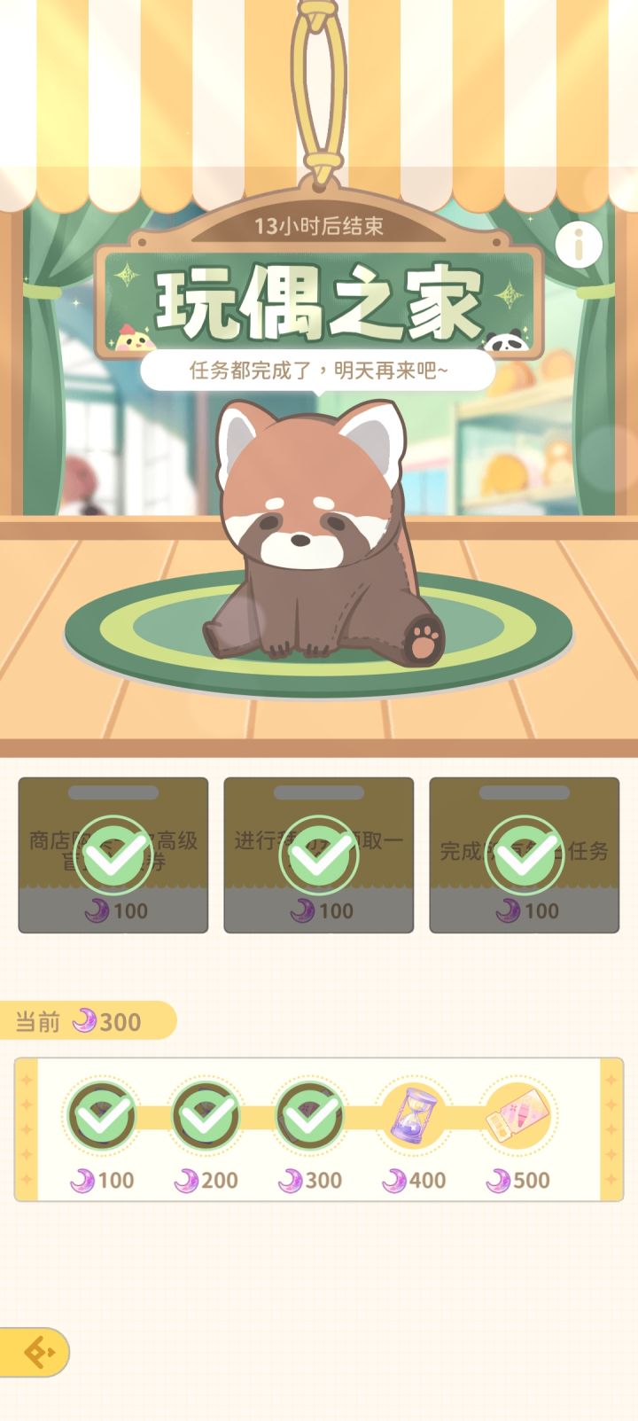 这个新的玩偶之家活动时间只有一天,任务只有3个,一个一百月亮,那我下面五百月亮的奖励是放那让我看的是吧?点熊就说没任务了,我真的…难受死了。谁能告诉我这样正常吗?