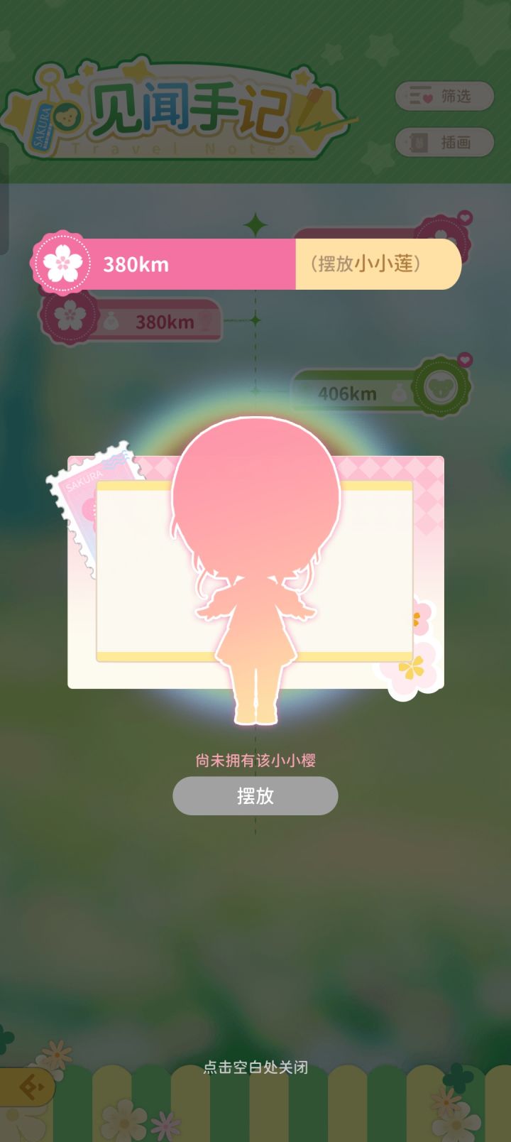 如图,我有小小莲,380km的时候需要摆放小小莲,为什么我不能摆放啊#魔卡少女樱回忆钥匙