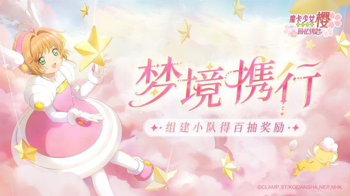 夜幕降临,你发现自己坠入了一片繁华的梦境——粉色的云朵层层叠叠,绵延至天空尽头;巨大的繁星兀自闪烁,从空中垂下;微风掠过,天空奏响了一曲光影交错的歌谣。和伙伴们组建小队,一起游历吧!✦活动时间✦即日起-10月6日23:59✦活动介绍✦入梦者可点击链接:或在“魔卡少女樱回忆钥匙官方”公众号回复“百抽”,即可前往玩法页面参与「梦境携行」活动。活动期间,入梦者可与好友组建三人小队,点