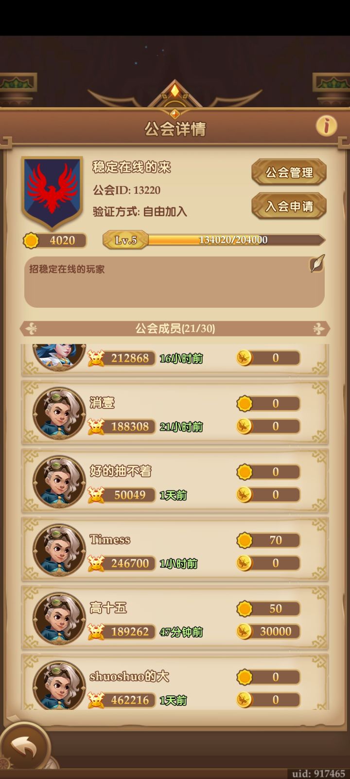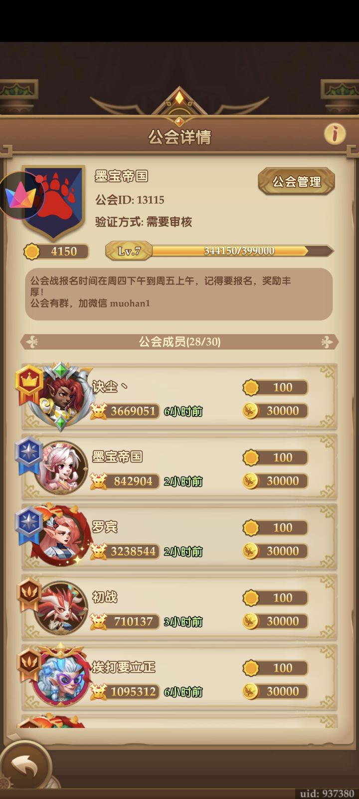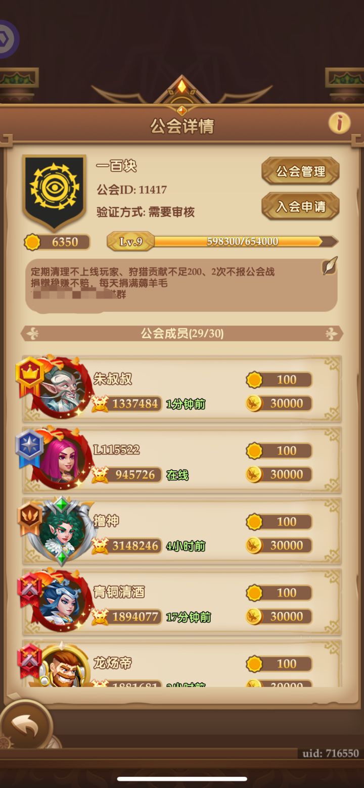 休闲公会招人,公会ID 13115。墨宝帝国目前3级(快4级了)。18人(16,17和稳定活人)。新手需要助战英雄的可以进会加加高战好友借用。休闲老手可以加入一起养老休闲。每天收菜,每周打打公会战(不计较输赢)拿拿低保福利的可以来。自由加入不用审核。会长活人会清理弃坑的人,有意向直接加哈开心