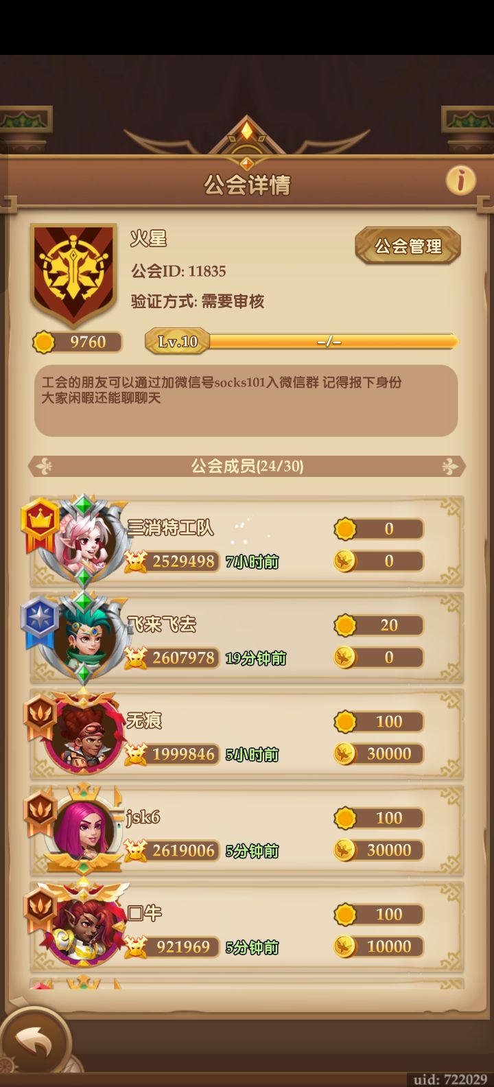 十级公会招人,有活跃就行,休闲养老! 普通高级boos全满 特殊boos6万以上 公会ID10584