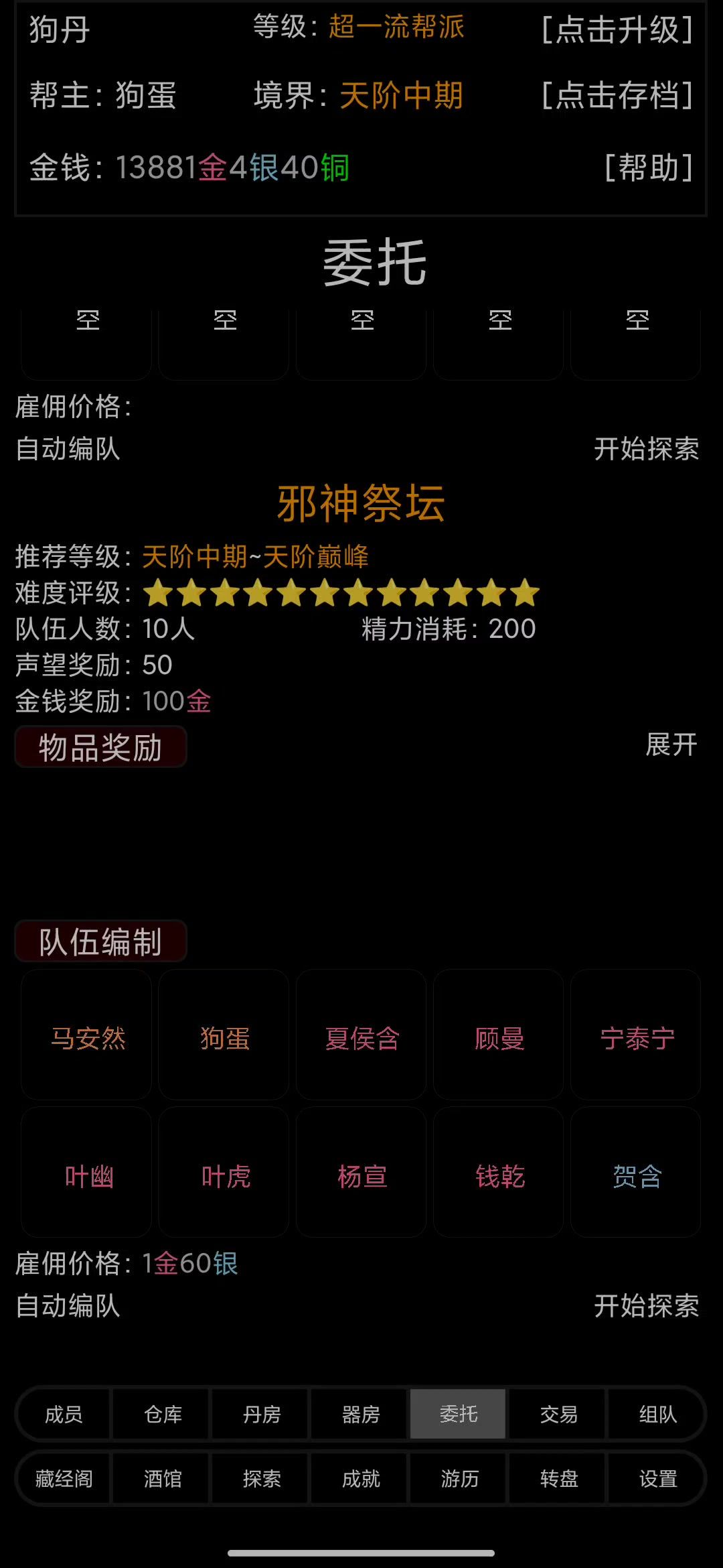 邪神祭坛关键点是boss闪避236% 虽然是低配,我也把等级搞到了天阶后期,因为这个帮众灵念不高。实在搞不到240的无视闪避,还是搭配功法才勉强够。 功法全天阶,3下品2中品。 此配置无法单通,boss的60%减速打出来就只能等着被群殴归西。boss的无视闪避是124%,理论上闪避继续做到204%有可能单通。但是......我做不到 视频最后有boss核心参数,帮众用的功法和装备附魔。