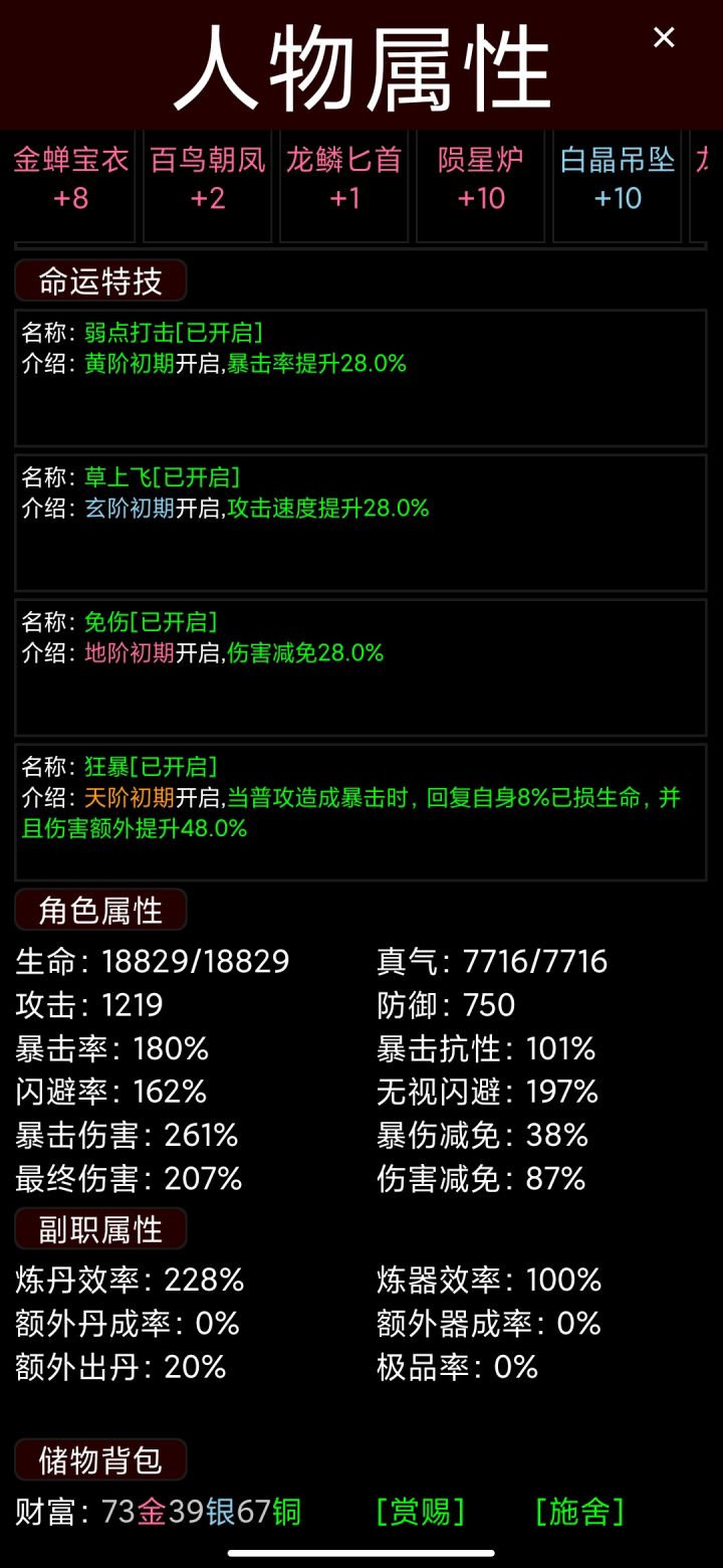 正常档,3天养出来的杰出升天骄。普攻吸血,命运特技地阶攻击38%吸血,天阶暴击加速。 天阶装备在后边,没来得及强化。 普攻吸血,只能做到2000攻击的,选暴击回血。 3000攻击才能考虑攻击38%吸血。 5000攻击,你吸不吸不重要了。