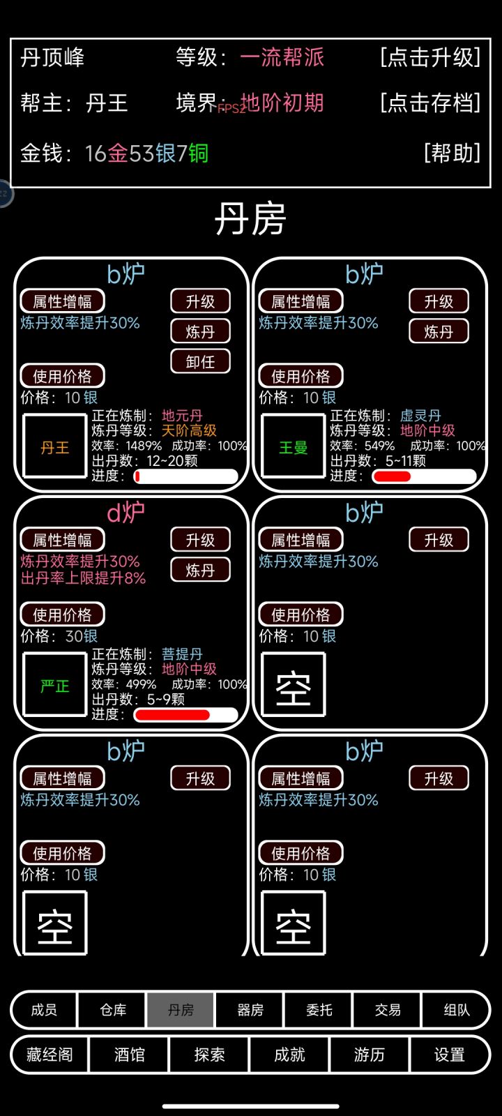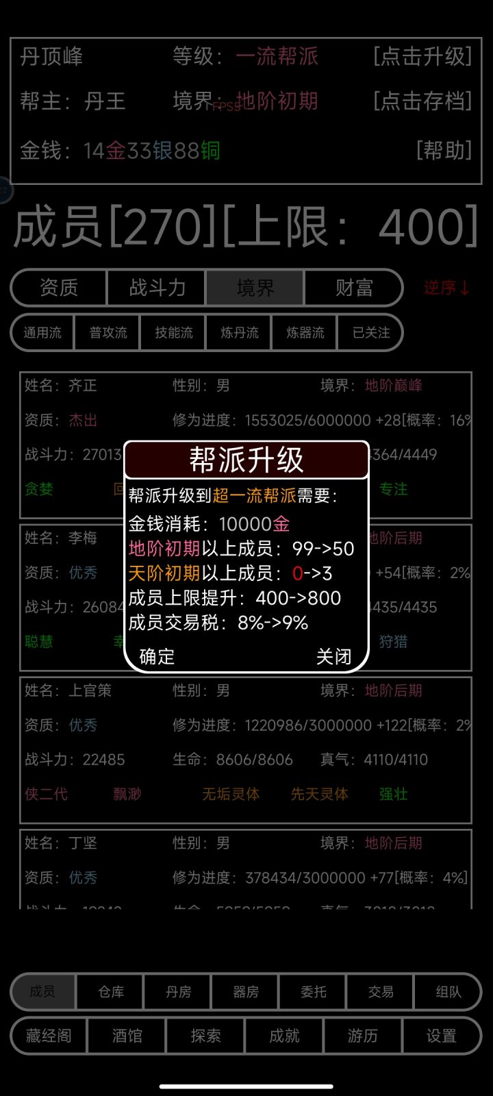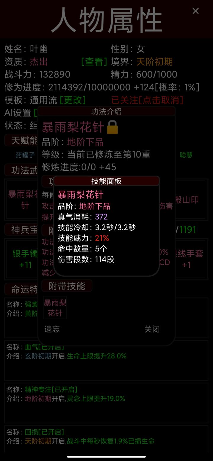 未强化完成,几乎全5级附魔,最终36W伤害。正常档的天花板,实在找不到红练武奇才又有灵念加成的。 理论上加一个功法和一个天阶4孔装备战力能上200W。最后,5个功法练完一共花了12小时在线挂机,要不是中午反复SL洗练出橙练武奇才和粉侠二代加速100%........不敢想,可能下周一我都不一定能录这个视频。 这个档是我最老的档,三周了,只干预过这个帮众。所以没有5个天阶巅峰,没能升级。这货今天挂机