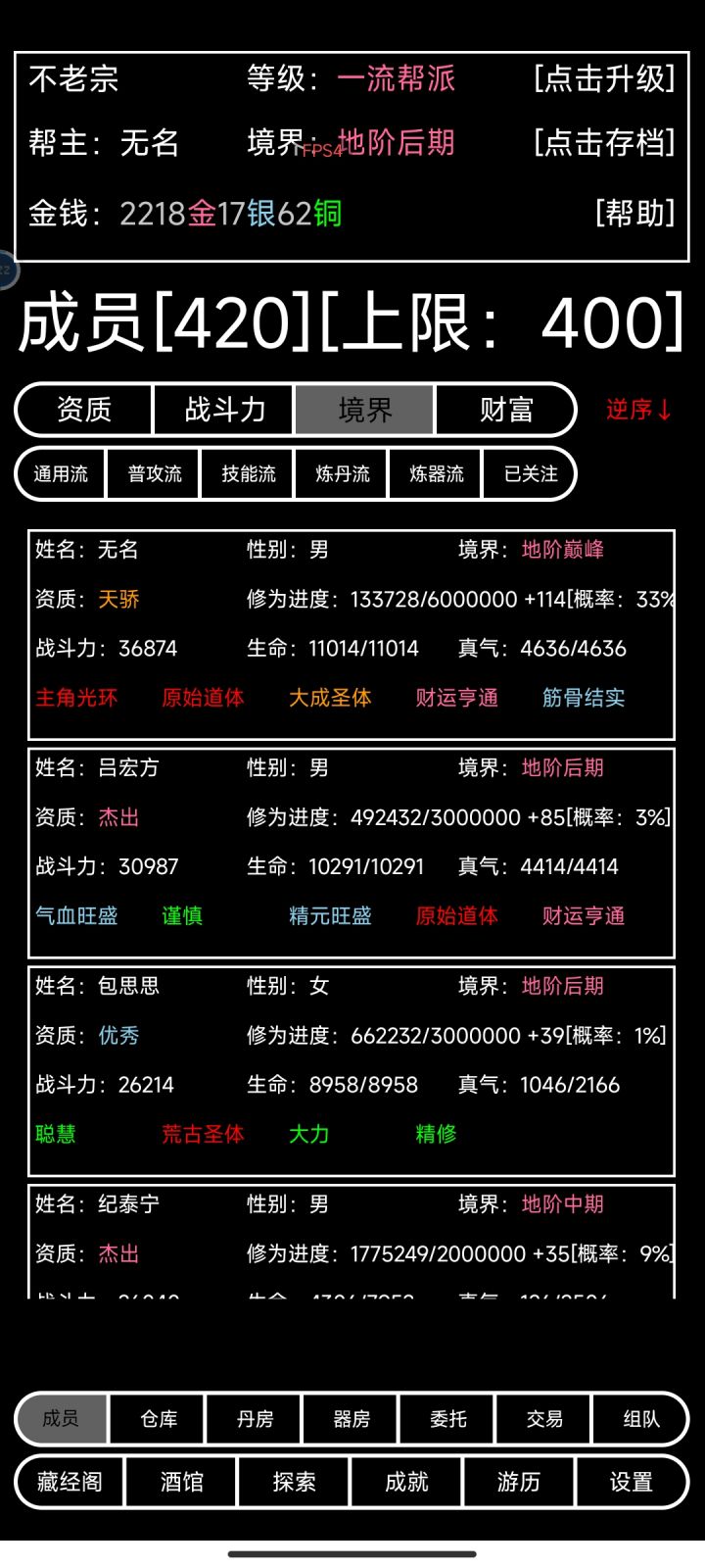1炼丹房,丹房帮派成员使用后获得金钱2炼器房,和丹房一样,这两种前期获得金钱都很慢,不推荐多建造3藏书阁,帮派成员学习后可以获得金钱,这个一次性消费,主要看帮派成员数量决定4酒馆,客房消费,钱少重复消费高5交易税,前期人少收入低6委托,可以直接活动金钱,看任务星级7探索,直接卖材料或者二次加工成丹药丶装备#攻略
