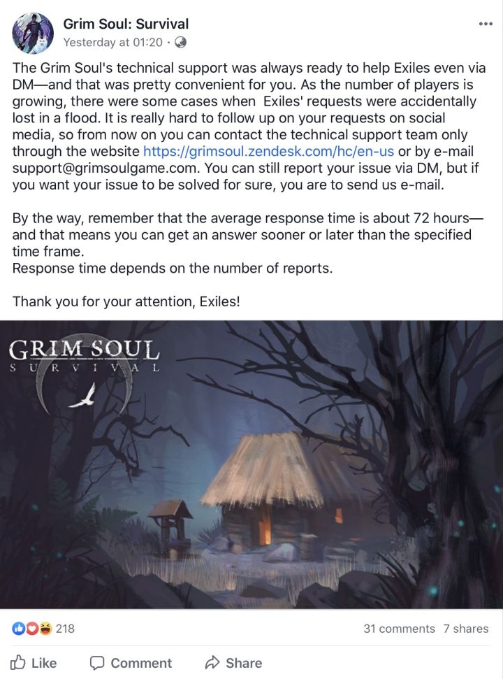 冷酷灵魂的技术支持永远服务于流亡者,即使是通过dm对你来说也会很方便。随着玩家数量的增长,有时流亡者的请求会意外丢失。在社交媒体上跟进你的请求真的很困难,所以从现在开始,你只能通过网站https://grimsoul.zendesk.com/hc/en-us或电子邮件support@grimsoulgame.com联系技术团队。您仍然可以通过DM报告您的问题,但是如果您希望您的问题得到解决,您可以