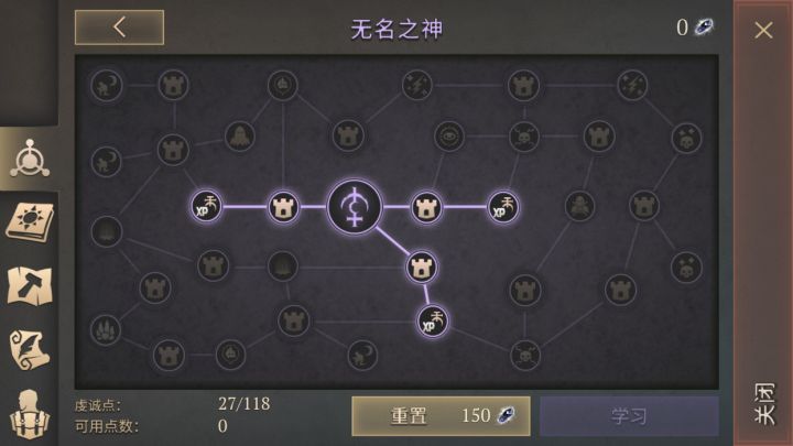 首先最近的这个阵营不知道怎么选,在众多玩家都选择教会的时候,我选择完成任务最简单的无名之神。然而他却带给我巨大的惊喜。因为他简直就是肝帝首选,升级达人。因为他将给你带来所以怪物百分之30的经验加成。(注:还可与所有加成叠加)最开始不明白这个触发高等力量是什么意思,其实就是当你击杀了骑士就触发了。无名之智,每个加成百分之十,最高叠加百分之三十,点满共需27个虔诚点(刷虔诚点在两个图来回循环跑图,当