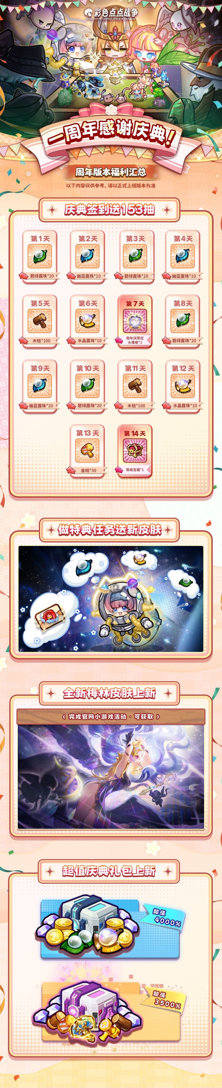 亲爱的召唤师们,时光悄然翻过一页,我们的冒险之旅即将迎来一载春秋,1月15日《彩色点点战争》一周年感恩庆典即将开幕~每一次探索,每一次收获惊喜,都如星光,点缀我们共同的欢乐旅程,愿我们在未来的游戏路上,继续携手同行,满载而归~我们准备了诸多一周年庆福利,召唤师们不要忘记上线,同时月光还精心准备了现金福利活动,快来参与活动,领取专属于你的周年限定惊喜吧~➤活动内容🕐︎活动时间2