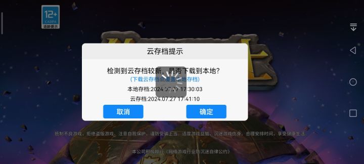 中午玩了一会,先在进游戏中间那个圈就一直在转。没法进行任何关于游戏的操作,除了强制丢出后台。解决方法 1:云存档后( ※ 首次进入后云存档,系统也会自动存档“到本地”,在第二次进入游戏后会“进行”云存档,云存界面消失后进行第二部 ),删除游戏内存(不是软件)后重进游戏登录即可。解决方法 2:云存档后,删除游戏重新下载。
