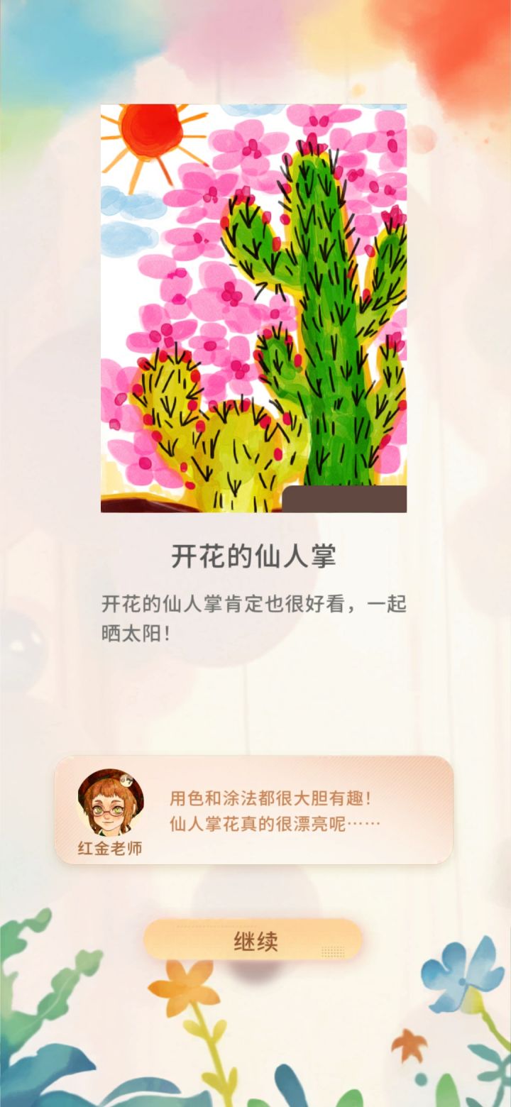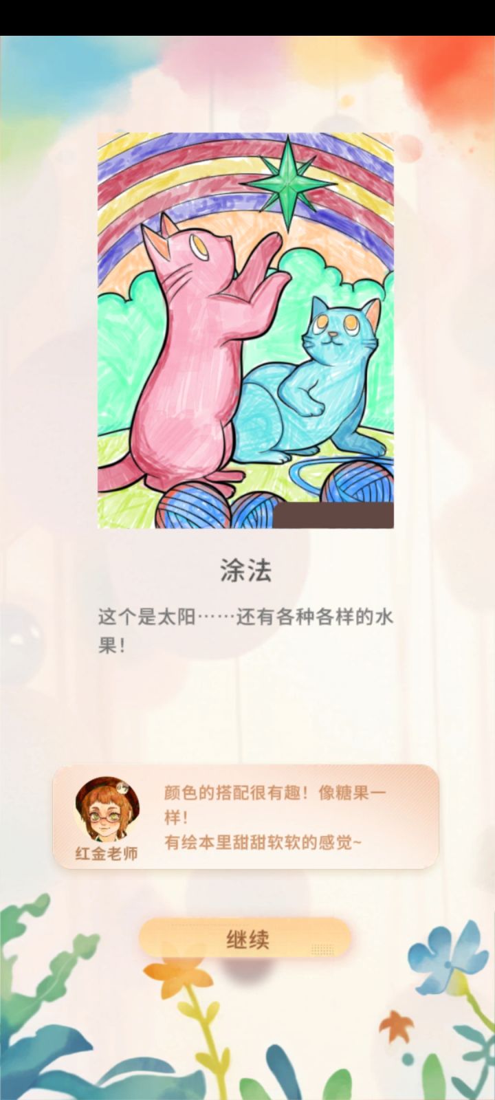 我嘞个豆,这绘画水平直线上升啊,我记得上星期还是手掌花,现在直接整了个猫猫出来,不过描述好奇怪,哪里有太阳和水果呀