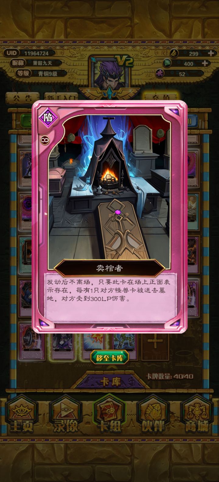 游戏id:11964724游戏昵称:箫韶九天收集度:74.67%大家入坑都比不多一个月了收集度也上来了,上期打开了自闭卡后大家玩后说打的太憋屈,那么不死族卡组套路也提上日程卡组思路:不死族特性,每回合可以发动一次效果,从表面状态变回盖牌状态,同时还可以改变其他盖卡的位置(电脑随机,也可能不变)意味着这游戏变成了你猜我猜我猜猜猜首先以彷徨的木乃伊为主,每次变回盖卡可以改变位置