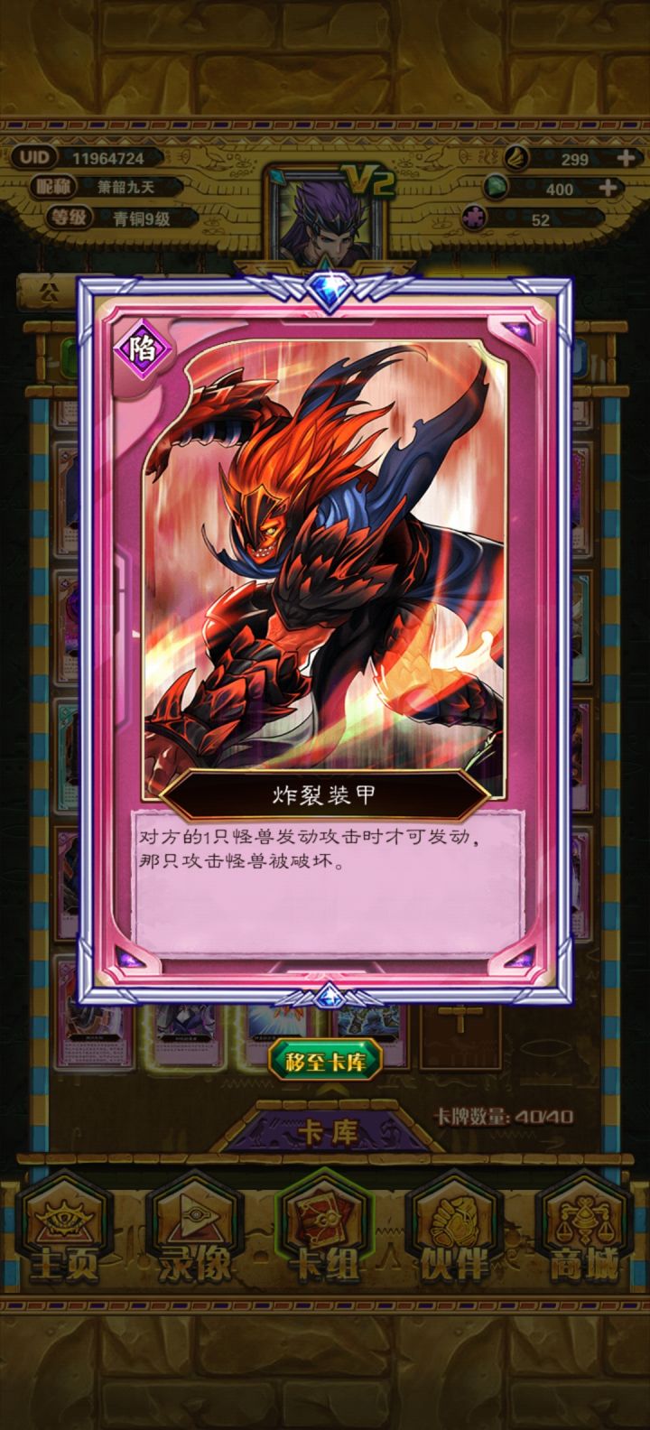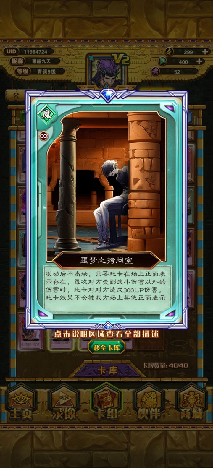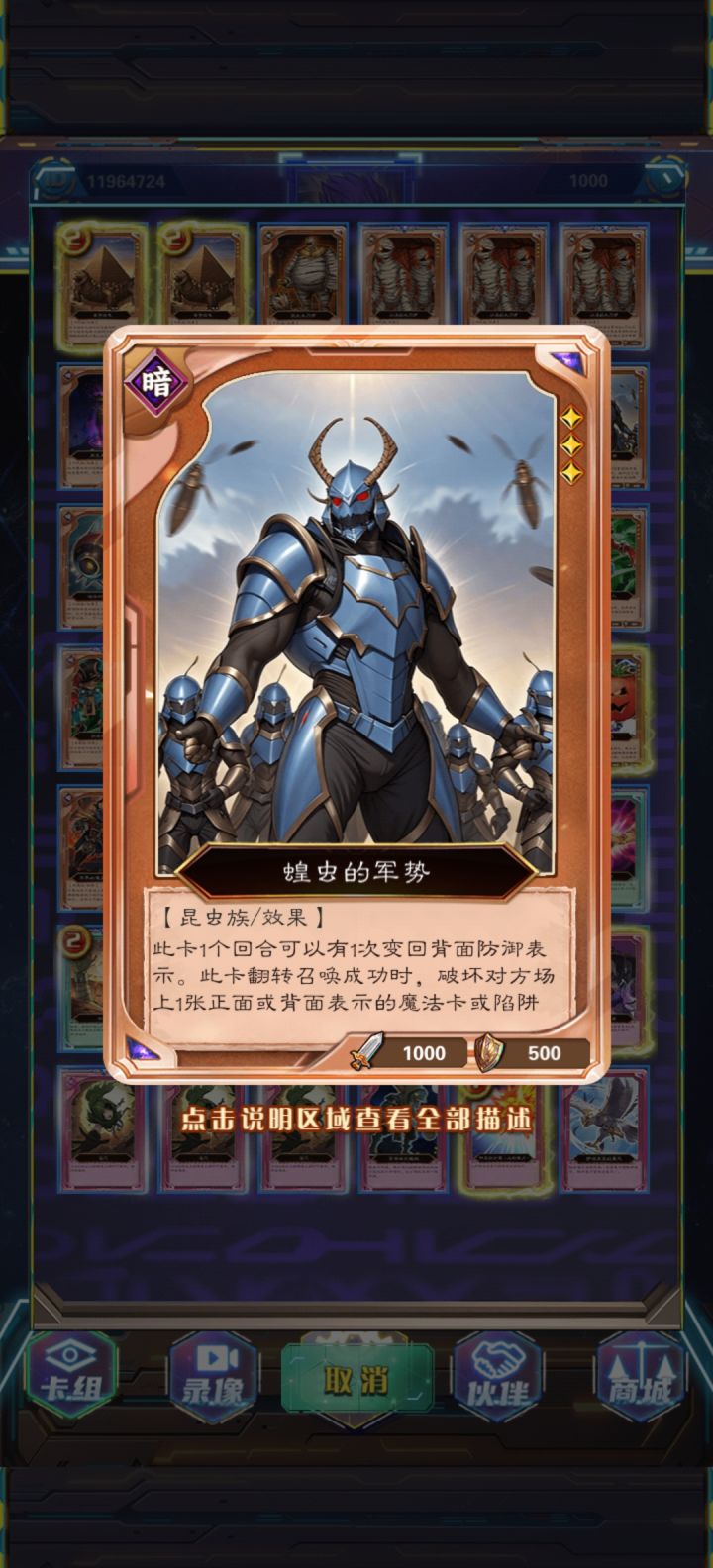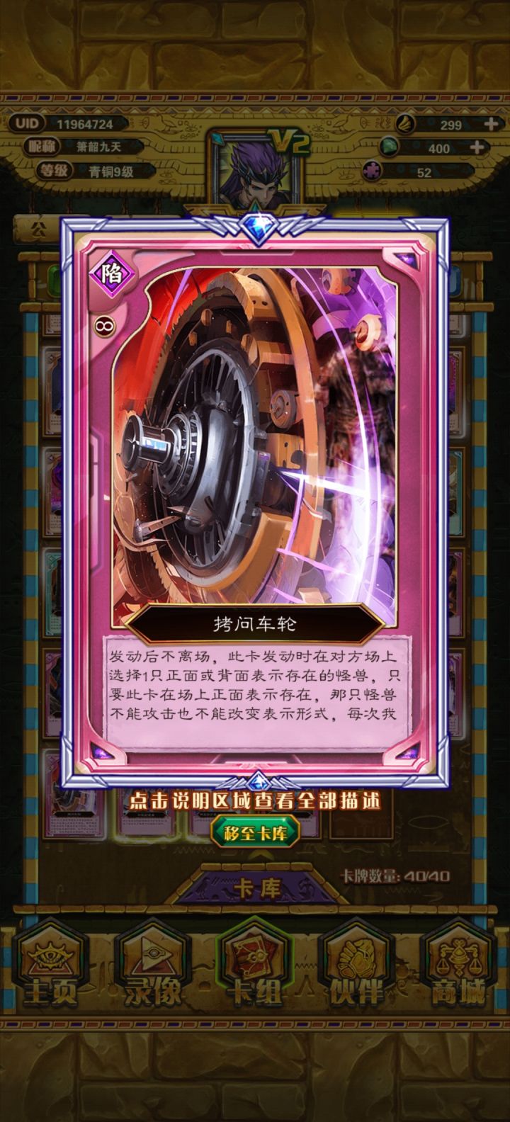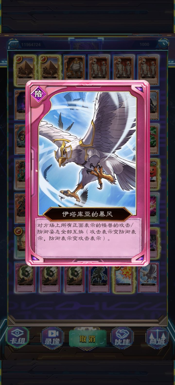 游戏id:11964724游戏昵称:箫韶九天收集度:69.38%入坑差不多一个月了,游戏卡组大家都收集的差不多,目测人均三落穴,一个激流,双反射装甲,圣防的对手打的实在没脾气,还打的提心吊胆,为此针对这种三落穴,双反射的大佬我们只能出奇制胜!玩过游戏王混沌力量城之内的应该听说过,自闭削血流。意思就是完全不攻击,怪卡用盖牌形式发出,也不用主动攻击对方,达到缓慢让对方扣血的目的!