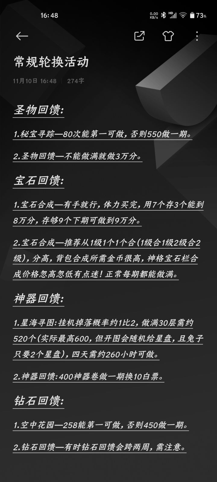 1.宝石工坊开启4倍合成的时候,会出现一个2的宝石。不知道有没有被坑的,你可以开启1倍合成,再合成一个2就行,其余就是2048玩法。第一次玩的时候就被坑过。2.前期阵容作为普通玩家,资源有限,很难拉满6个角色,氪佬除外。建议可以主养三个角色,为防止虚战情况,其余三个角色不上装备和宝石,从神带贞德和祝融。目前本人这样搭配,众神比较容易拿靠前名次。欢迎大佬推荐更合理的玩法。ID:24ac