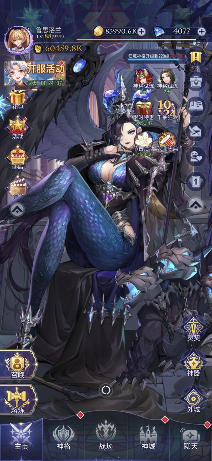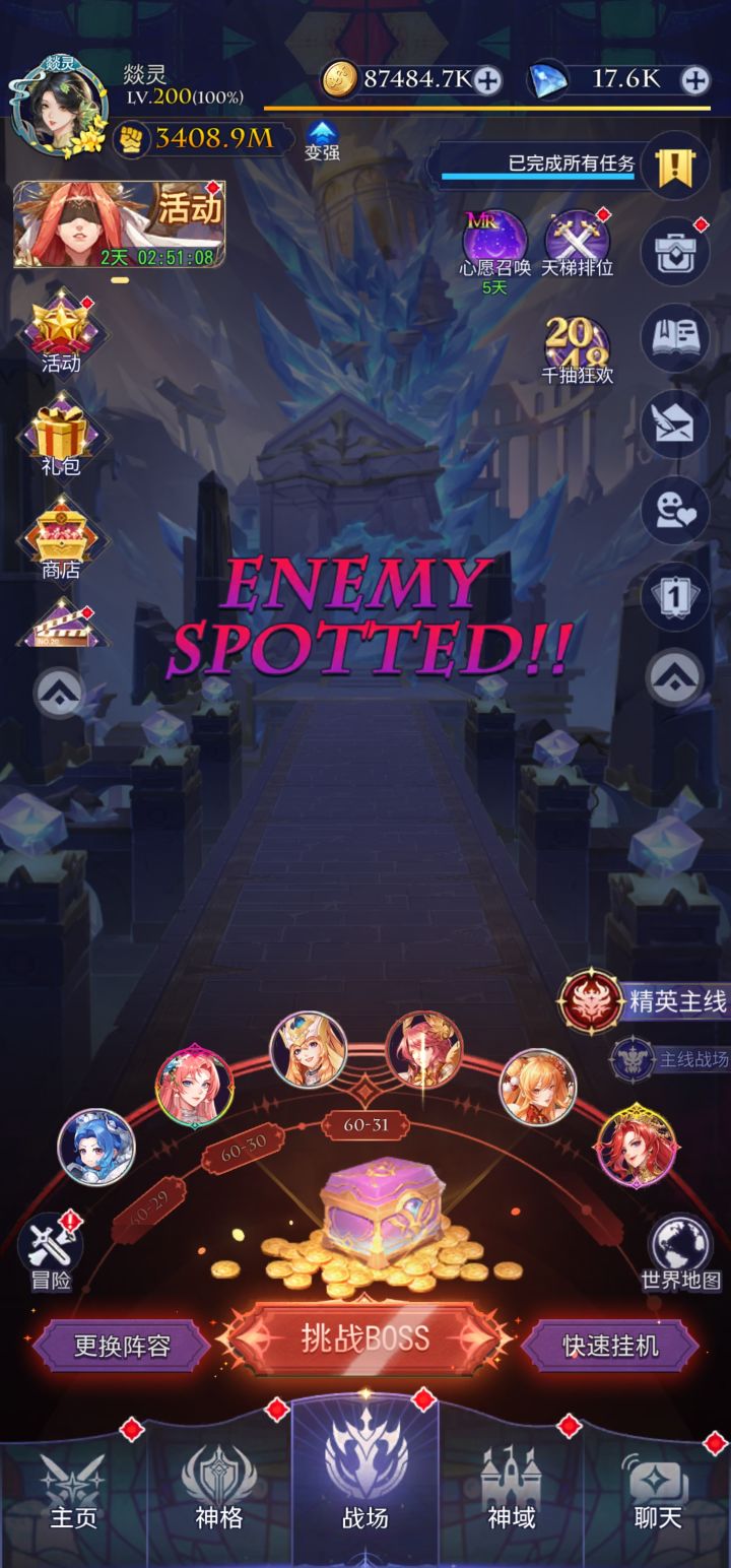 本人偷学永无止境 上届天梯全服第一曾把三个号分别在50天,40天,20天内通关普通主线 我的主线攻略包括角色,从神,神器,装备进阶,圣器,宝石,符文,御灵,星图,命星以及灵活占位,预计800M通关首先注明以下攻略是哈迪斯通关攻略,可能通关效率不及伊西斯但哈迪斯在其他的场景全能,适合绝大多数非重氪玩家角色:路西法(万金油辅助) 赫拉(需氪金获取 替代品:主角) 伏羲(增伤辅助) 女娲(U