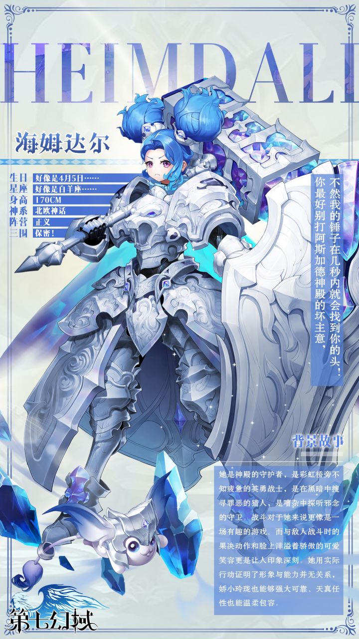 古旧的羊皮卷内,封存数位女神的档案,今天小跟班带来了海姆达尔的详细档案,供各位天选者了解!档案1神系:伟大的北欧神话!阵营:正义!正义就是一切!生日:好像是4月5日……星座:好像是白羊座……身高:没测过!但肯定有1米7!哼!三围:保密!再问就用锤子敲你!档案2在人间,她是传说中的破晓之神,是神界中神秘的存在。她为人们带来众神的礼物,创造新的生命。人们崇敬她,她也爱护并守护着这世间