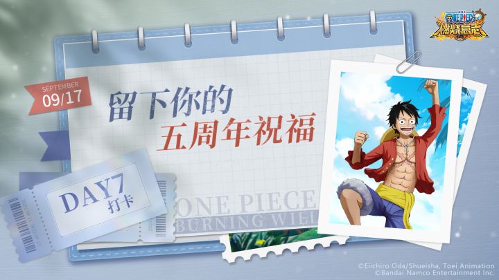 喜讯,喜讯,热烈庆祝《航海王:燃烧意志》即将迎来五岁的生日啦!!!为了感谢各位船长这一路的陪伴,我们为大家准备了礼物~快来送出你的周年祝福,赢取好礼吧!【活动时间】2023年9月8日-2023年9月21日【参与方式】在评论区留言,送上你的祝福即可成功参与活动!如:祝燃烧意志五周年生日快乐,希望燃烧意志越来越好!【活动奖励】随机抽取10位船长送出游戏礼包*1(盖楼达到66层);随