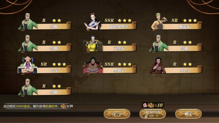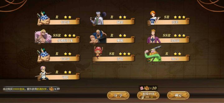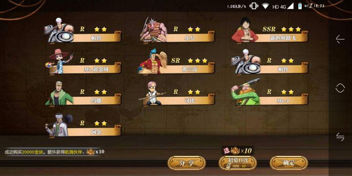 才玩有大佬教学吗?草帽四人用了我80抽,还以为抽明哥小马哥要用我40抽左右,刚刚凑齐十抽就去试了试水,然后把剩的一张普通招募用了,结果。