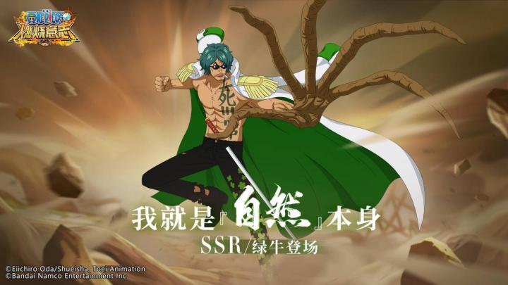 他与“藤虎”一笑一起通过“世界征兵”被特别任命为海军大将;他是“森森果实”的能力者,能够将身体变成树木。他对“赤犬”萨卡斯基怀有强烈的憧憬,并为了得到赤犬的赞赏而擅自采取行动——他就是海军总部大将“绿牛”荒牧。在游戏中,SSR绿牛将充分发挥他森森果实的能力,并且展示出作为海军大将的超强实力,让我们一起期待他的到来吧!