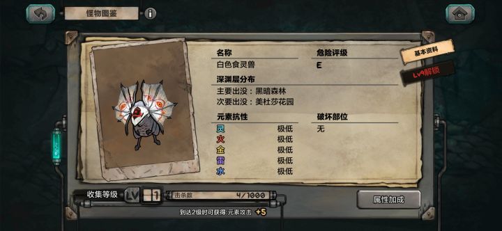 怪物对各属性的强弱度,用图或颜色来直观表达,更好。你都借鉴"怪物猎人"了,不差这个优化。#优化建议