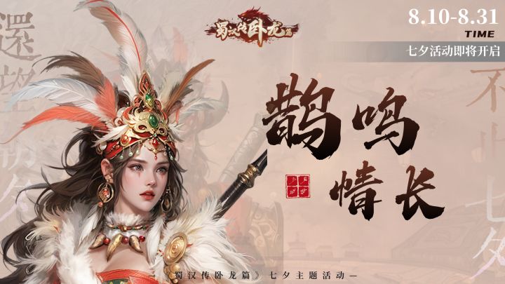 💌亲爱的主公,在这浪漫的七夕佳节,《蜀汉传卧龙篇》为你准备了一系列精彩纷呈的活动!🌷新『七夕活动关』已上线,10号0点开启挑战排行,期待您前往体验!更有活动详情请往下看~---------------------------------------《蜀汉传卧龙篇》七夕活动爆料活动主题:七夕·鹊鸣情长活动时间:2024年8月10日-8月31日----------------------