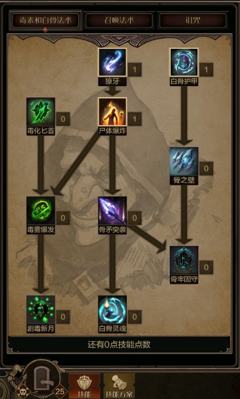 阴雨绵绵的午后,适合探讨一些神秘的课题。今天同大家分享一下作为死灵法师的召唤诅咒流派如何在25级之前培养你的黑暗军团。一、毒素与白骨的咒语:新手死灵法师们,应该重点关注哪些技能呢?首先,咱们给"骨牙"施法赋予一点点能量,它不仅可以吸引敌人的注意力,而且它的攻击能力也不容小觑。然后,我们给自己披上一层"白骨护甲",这可是在近战中免受伤害的好方法。接着要说的是"尸体爆炸"了,我们只需要略微学习一下