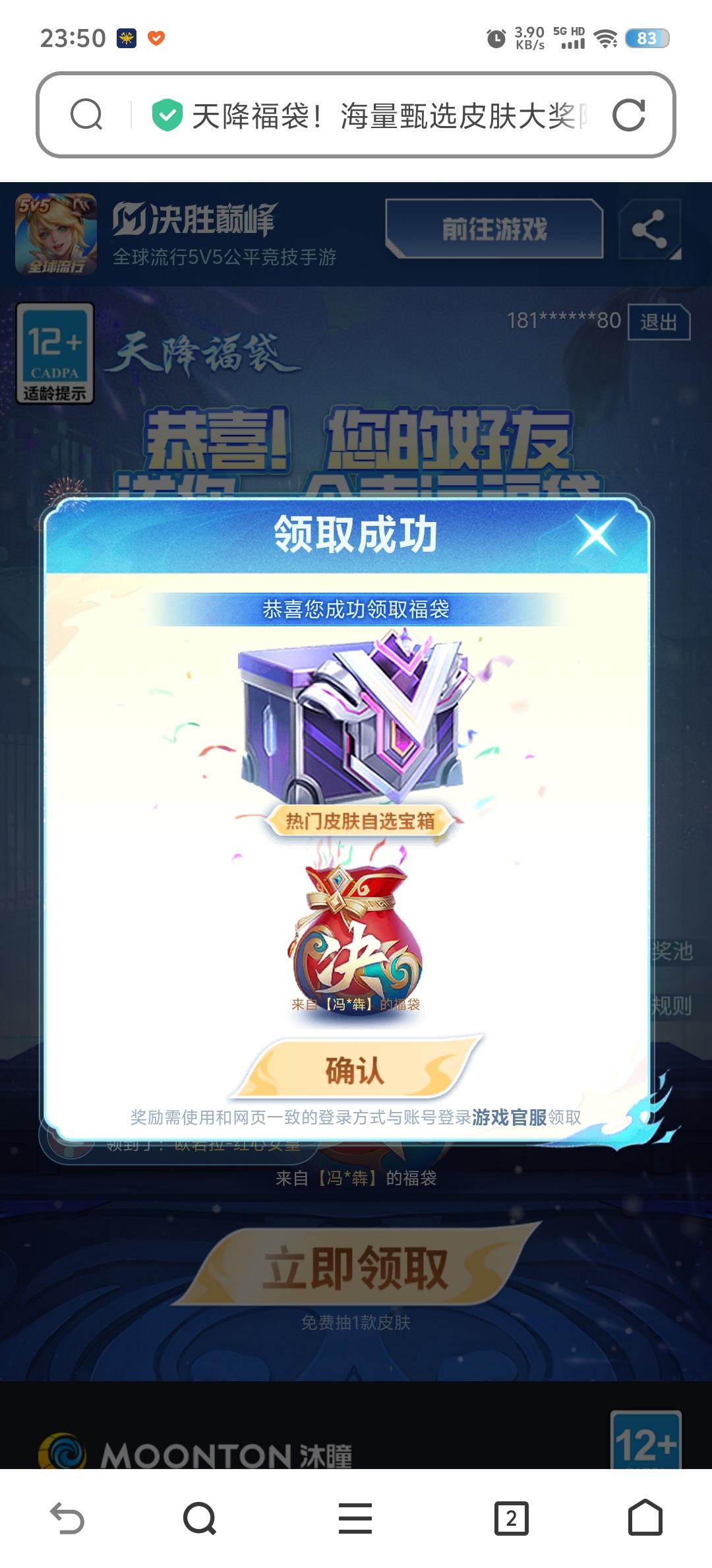 《决胜巅峰》天降福袋活动来袭!快领取我送你的福袋,免费领限时甄选皮肤大奖 :https://df.moonton.com/luckybag?code=444V85NG5e8b&from_source=game_wx