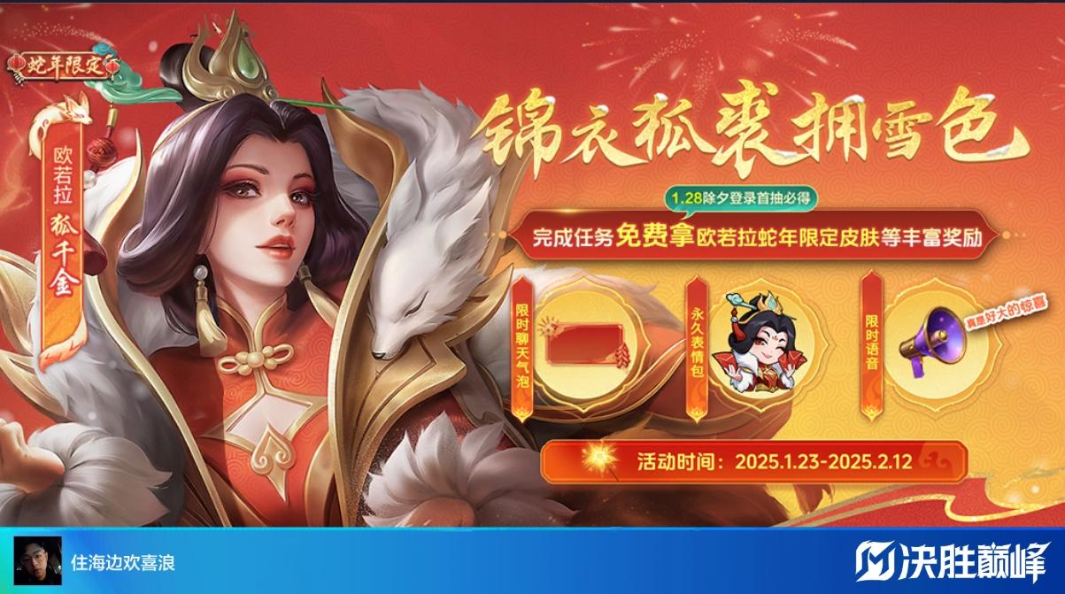 嫦娥「花好月圆」蛇年限定皮肤展示奉上——月兔悄悄跟我说,今天是花好月圆夜;你会和我一起,迎接新年的到来吗?1月23日-2月12日,参与新春活动【仙娥巧手宴饺香】,完成任务收集食材,即可免费兑换嫦娥蛇年限定史诗皮肤「花好月圆」,更有甄选皮肤自选宝箱、热门皮肤自选宝箱、新春限定战场表情、新春限时语音等奖励等你来拿!*展示内容为测试版本,以实际上线效果为准