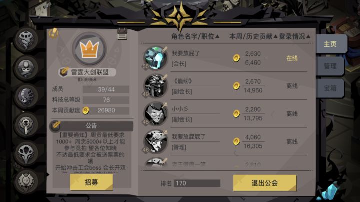 这个游戏现在人好少,我好不容易建个公会招点人,基本加入进来就变灰,那些大公会进去要的贡献又多,我这种在图二挂机还差4级才能去图三的人根本不划算,唉啥时候小公会能发展起来啊ID56275招活跃玩家,活跃就行不要一来就弃坑了