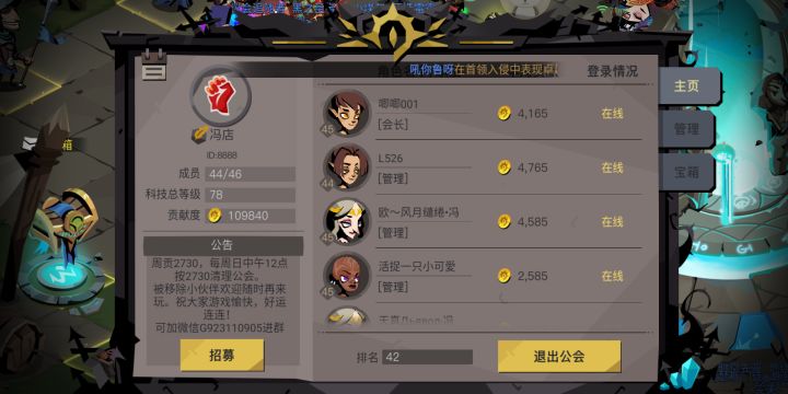 公会ID8888 公会情况见图!截图时间2019.11.3周日联系方式游戏ID23708675希望公会能稳定的发展。 欢迎还喜欢贪婪洞窟的小伙伴常驻。 祝大家游戏愉快!公会氛围轻松自在。欢迎还喜欢贪婪2的小伙伴一起来玩!
