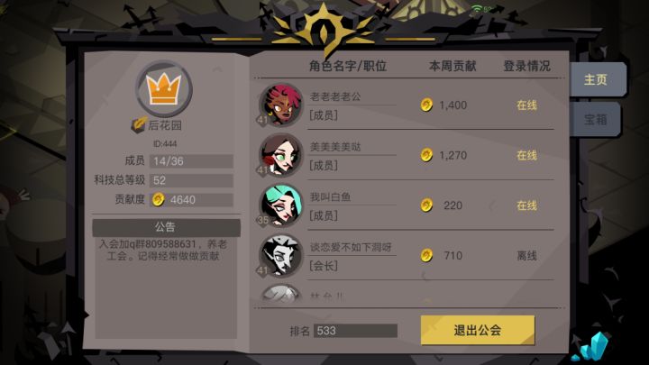 建立工会已经好久了一直是我们这帮肝帝守着孤独的工会,人员稀少,缺少活跃成员希望在这里能招到一些没有工会还喜欢说话的小伙伴,但是如果3~7天不登录会长不会留情的,贡献每天打打boss什么的,就算不做任务能弄到120的工会贡献值,不要求每周多少贡献值,但是绝对不会收10几天,20几天不登录的,每天晚上有的大佬有时间可以说一下带着打打暗金图,只要有时间就会有人带的,在没进暗金图之前基本不会有大佬带,所以
