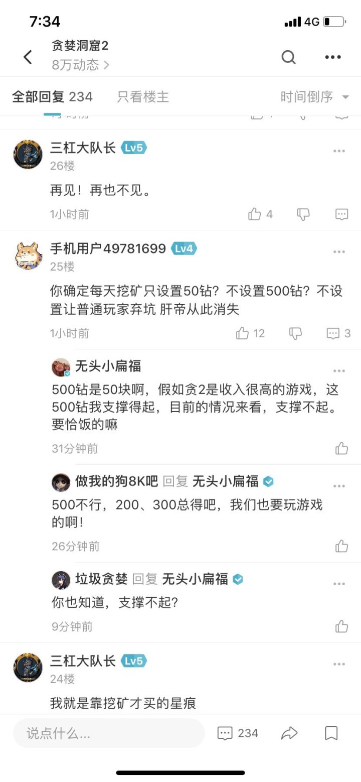 最近挖矿事件闹得沸沸扬扬,我也发表一下自己的想法。1,首先是对于利用bug挖矿的人,我觉得肯定不止这几十个,水晶数量也不止这么少,处理和给玩家的补偿太不满意了,严重影响了游戏公平性2,挖矿上限50钻。这个稍微有点少,我觉得100钻就差不多了。我想,玩这个游戏的大部分玩家都是学生党和上班族吧?我不明白,手动挖矿7/8个小时的人是怎么想的,不需要工作和学习吗?花这么多时间,就为了区区几十块的收益?