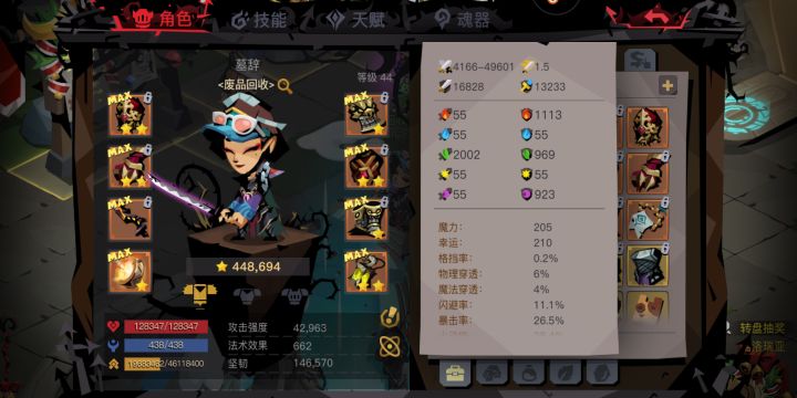 过普通图一了,感觉属性有点超标了,挺轻松的,魂器也没用,留在最后boss金身了,懒得解了。属性见下图,总体思路就是叠盾印,引爆,回蓝,8 9基本也没用净化。这次加强还是可以的。引爆盾印的话也可以不用开关暗辉,盾猛触发高也行,等43换把武器试试精英
