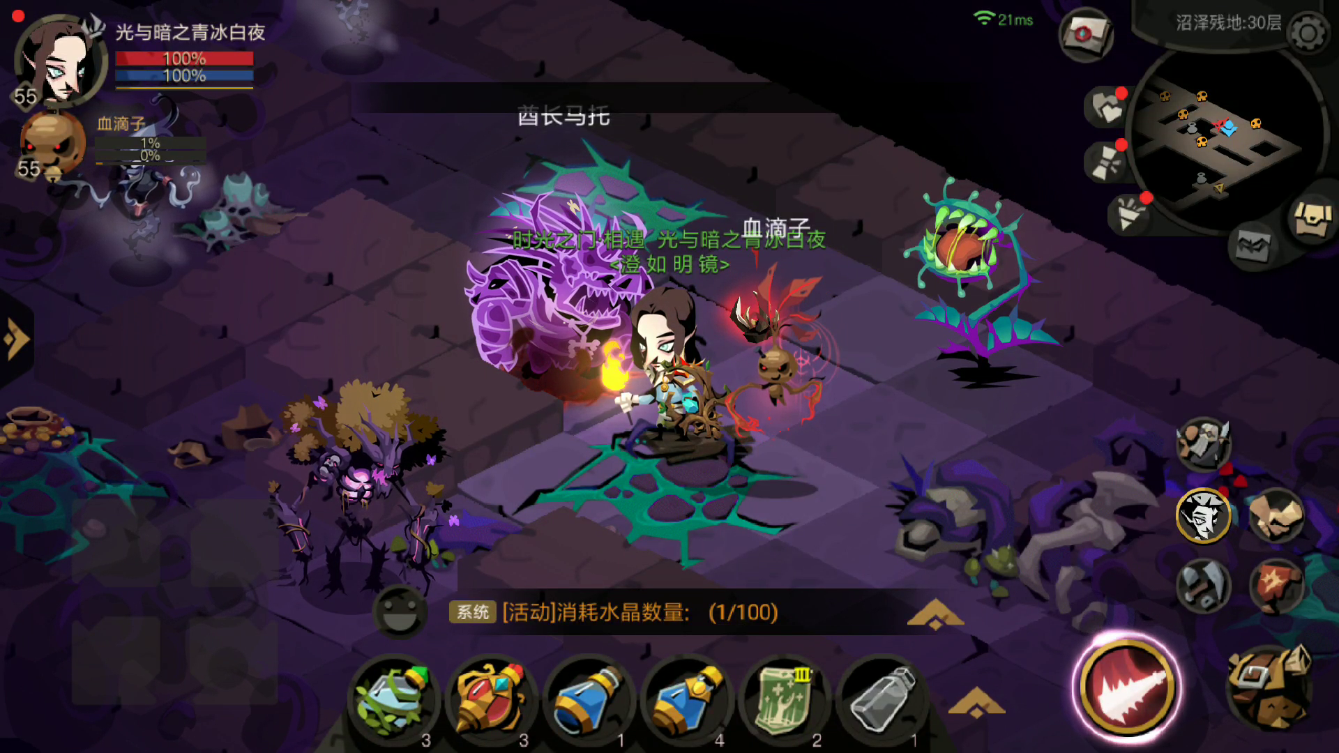 推荐天赋免费药水,没有就全清前几层多刷净化和安定。第21层金面起手会有一个沉默和致盲,金面会在80% 60% 40% 20%放闪电,如果词条是锋锐注意血量及时吃血瓶交魂器。第22层黑王水仙起手一个冰甲,然后一秒左右冻结,半血后会回复25%最大生命值,白给的守门员。第23层暴虐龙起手一个法力抑制,然后会接剧毒种子,同样属于白给的守门员。第24层香香开局一个高额伤害加上疲劳debuff(