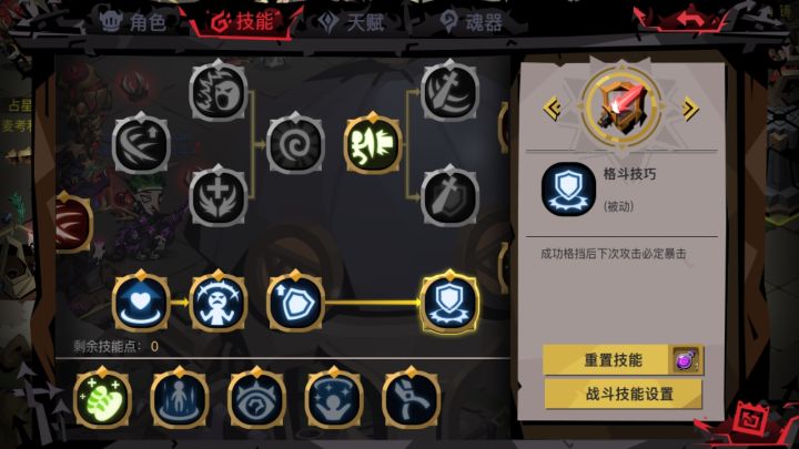 标题早就想这么写了,今天终于实践了,哈哈哈哈嗝~好了话不多说直接上内容。我觉得估计大部分人都是想得到的,要额外暴击当然是点剑盾被动哒~没错就是战魂盾!(误)法师的技能点太少点不到。。。就是这个!格斗技巧!格挡后下次普攻必定暴击,配合剑盾的被动格挡,理论上就是10%的暴击啊!理论上和暴击战魂绝配,然而我只是一条失去梦想的咸鱼,所以点了三吸报复emmm三吸比较稳,还是可以用一下的,暴击战